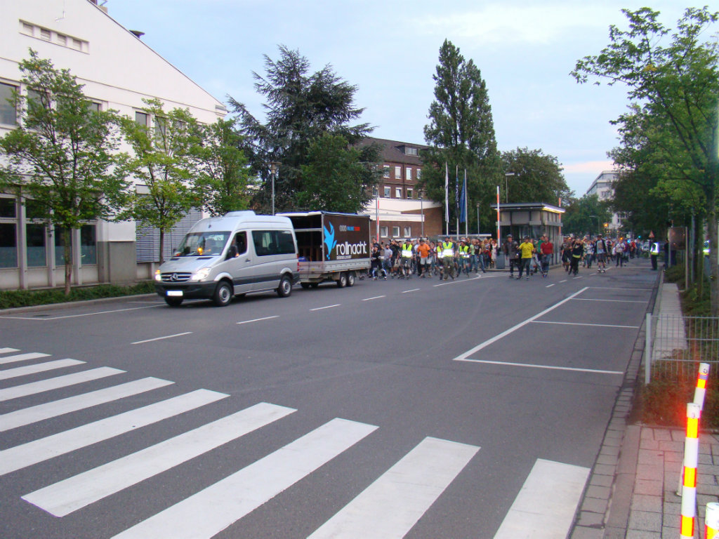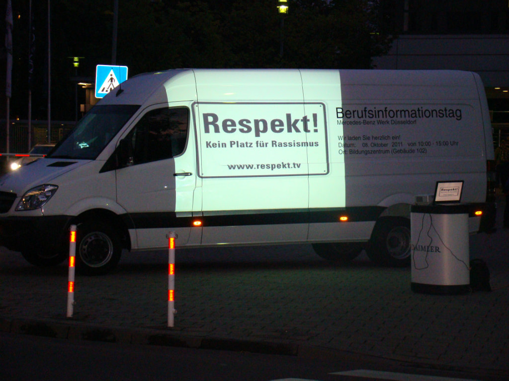 Die Tour durch das Mercedes-Werk galt als ein Highlight der insgesamt 9 Roll-Nächte. Die Skater legten hinter der Halle 150 ihre Pause ein. Dort wurden selbst erstellte Buttons von IG Metall-Betriebsräten verteilt, die bei den Skatern sehr gut angekommen sind. Das Logo der Kampagne "Respekt!" wurde auf die Seitenwand eines Sprinters der Ausbildung projiziert.