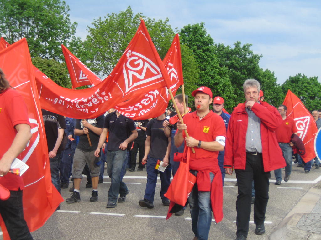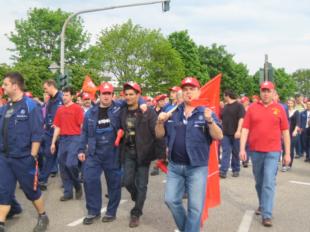 Am 30. April 2012 war es soweit. Mit Trillerpfeifen, Tröten, Plakaten und Fahnen ging es richtig zur Sache. Rund 2.500 Beschäftigte des Mercedes-Benz Werkes Wörth folgten dem Aufruf der IG Metall-Verwaltungsstelle Neustadt und legten die Arbeit nieder. Laut protestierend zogen sie vom Betriebsratsgebäude des Lkw-Werkes zur nahe gelegenen Bienwaldhalle in Wörth.