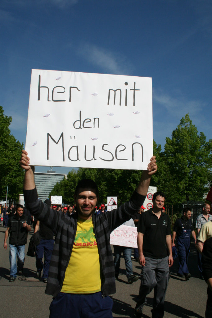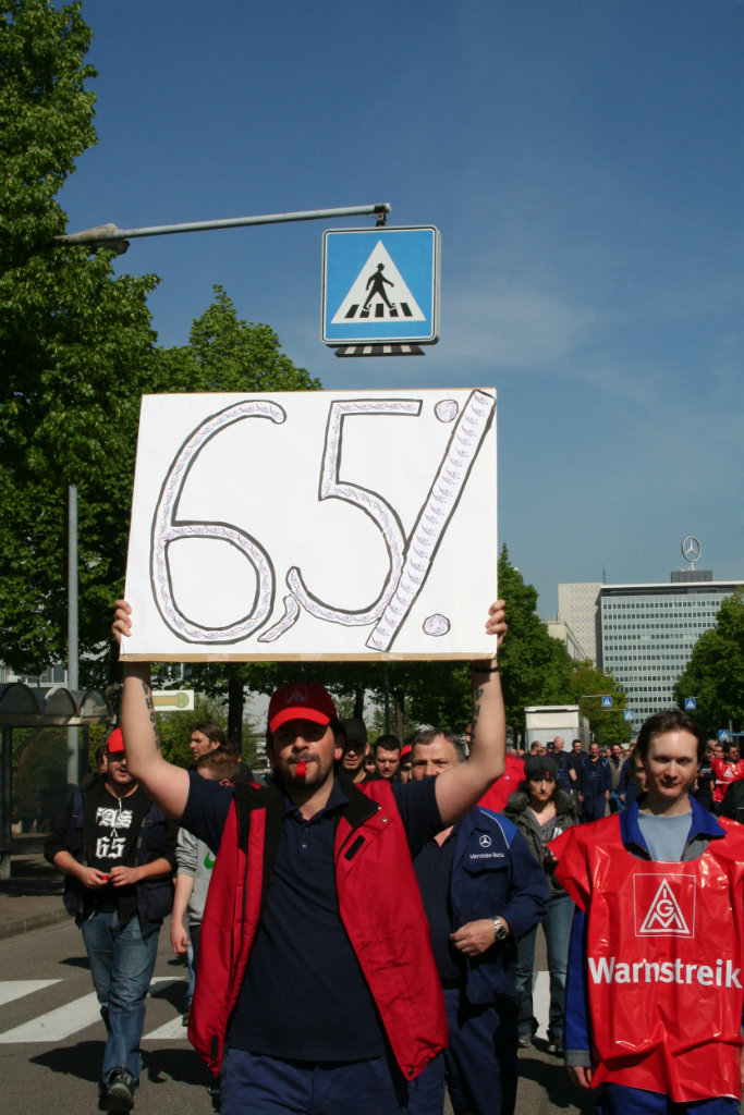 Über 4.500 Beschäftigte des Mercedes-Benz Werkes Untertürkheim, der Werkteile Mettingen, Hedelfingen sowie der Zentrale und der Nutzfahrzeugabteilung beteiligten sich am 8. Mai beim Warnstreik am Untertürkheimer Tor am Karl-Benz-Platz.