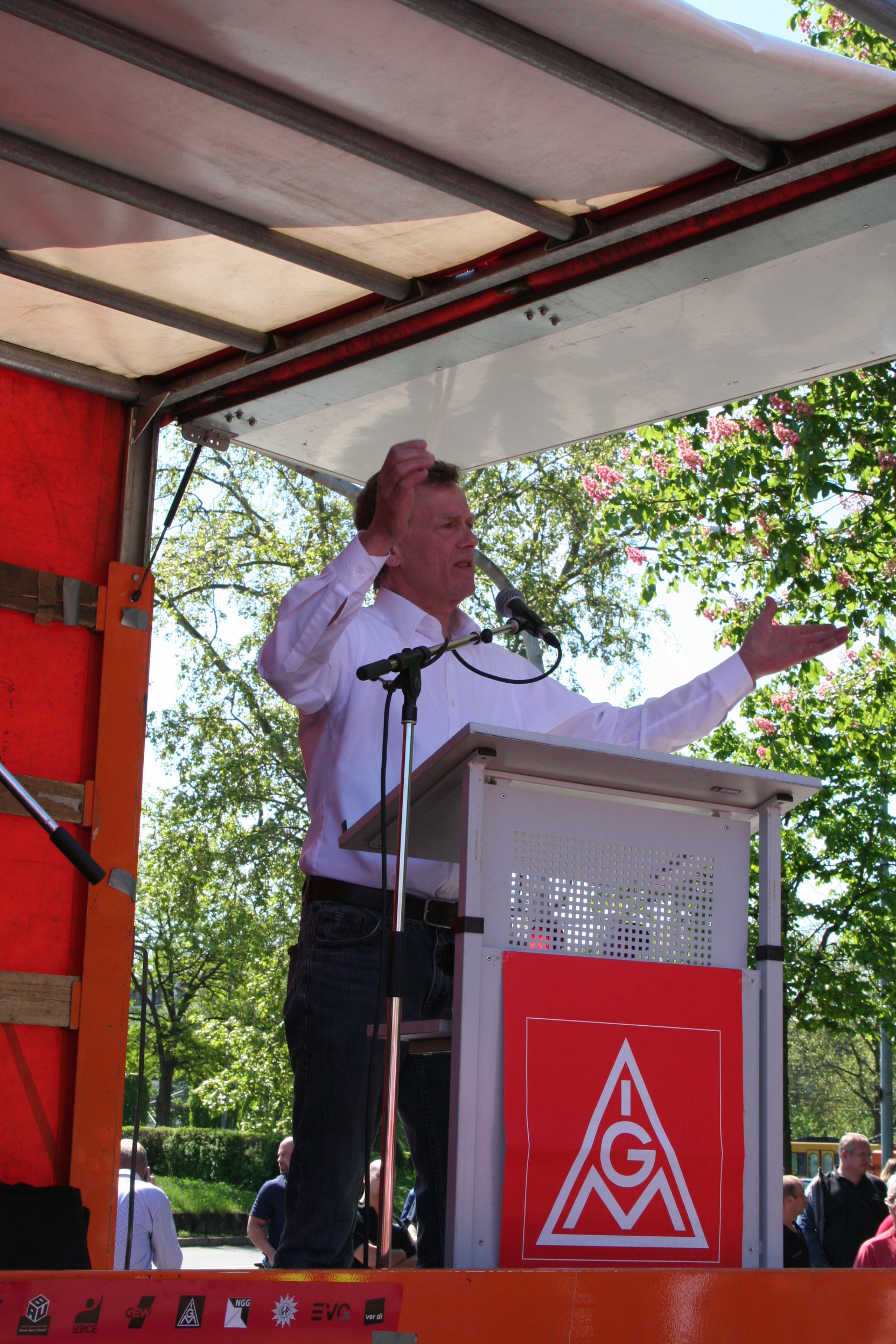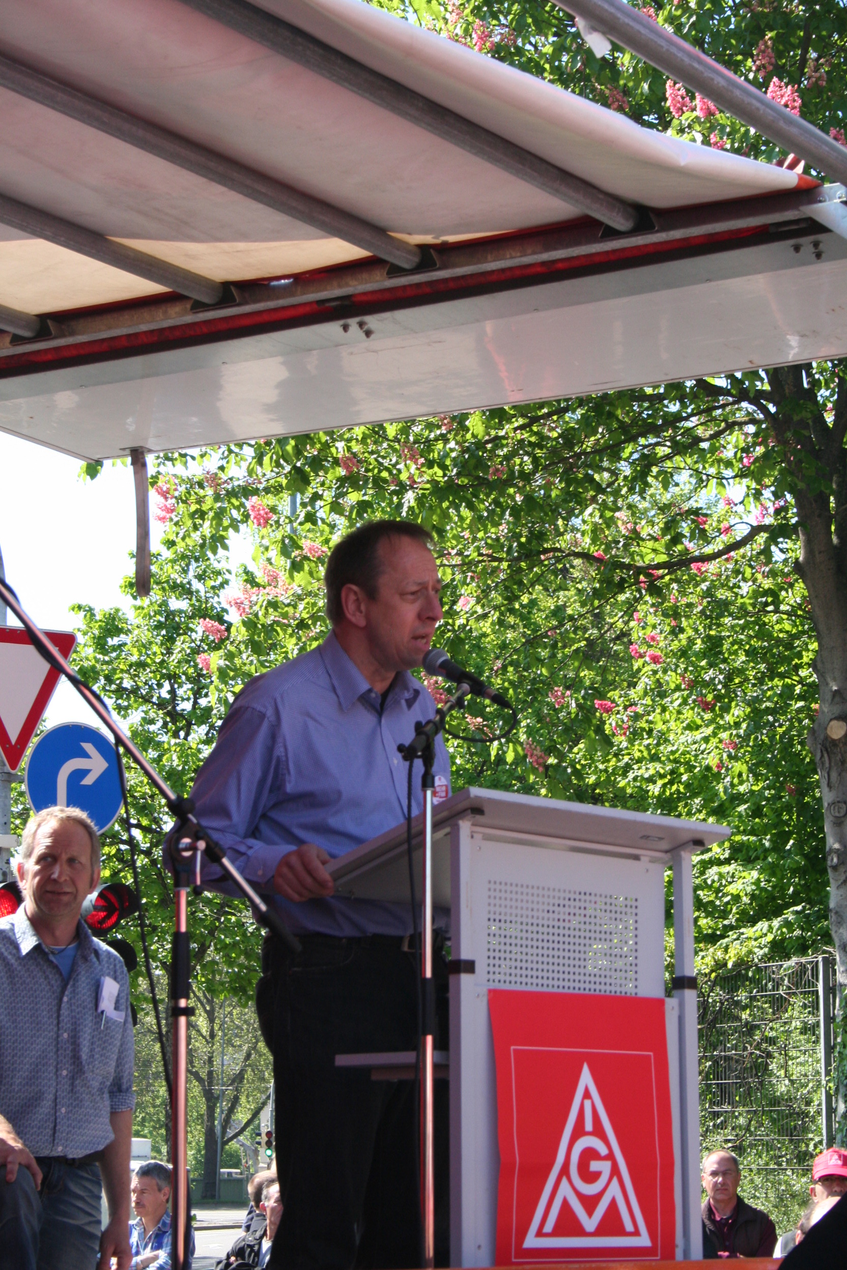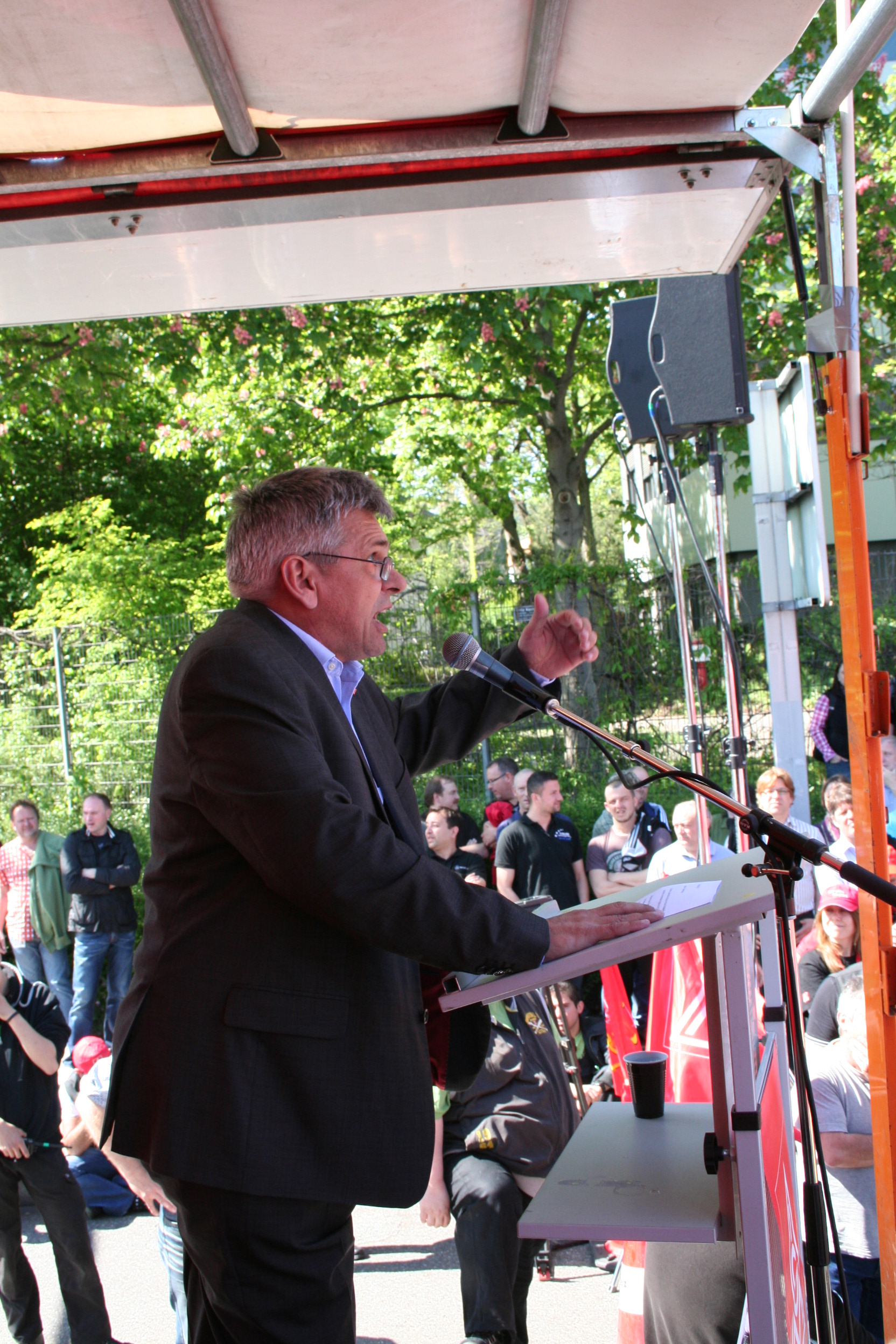 Jörg Hofmann, Bezirksleiter der IG Metall Baden-Württemberg, will spätestens in der fünften Verhandlungsrunde am 15. Mai erkennbare Fortschritte bei den qualitativen Themen sehen. "Kommen wir bis dahin noch immer nicht vom Fleck, droht uns womöglich eine neue Eskalationsstufe, die eigentlich niemand will", so Jörg Hofmann auf der Kundgebung am Karl-Benz-Platz.