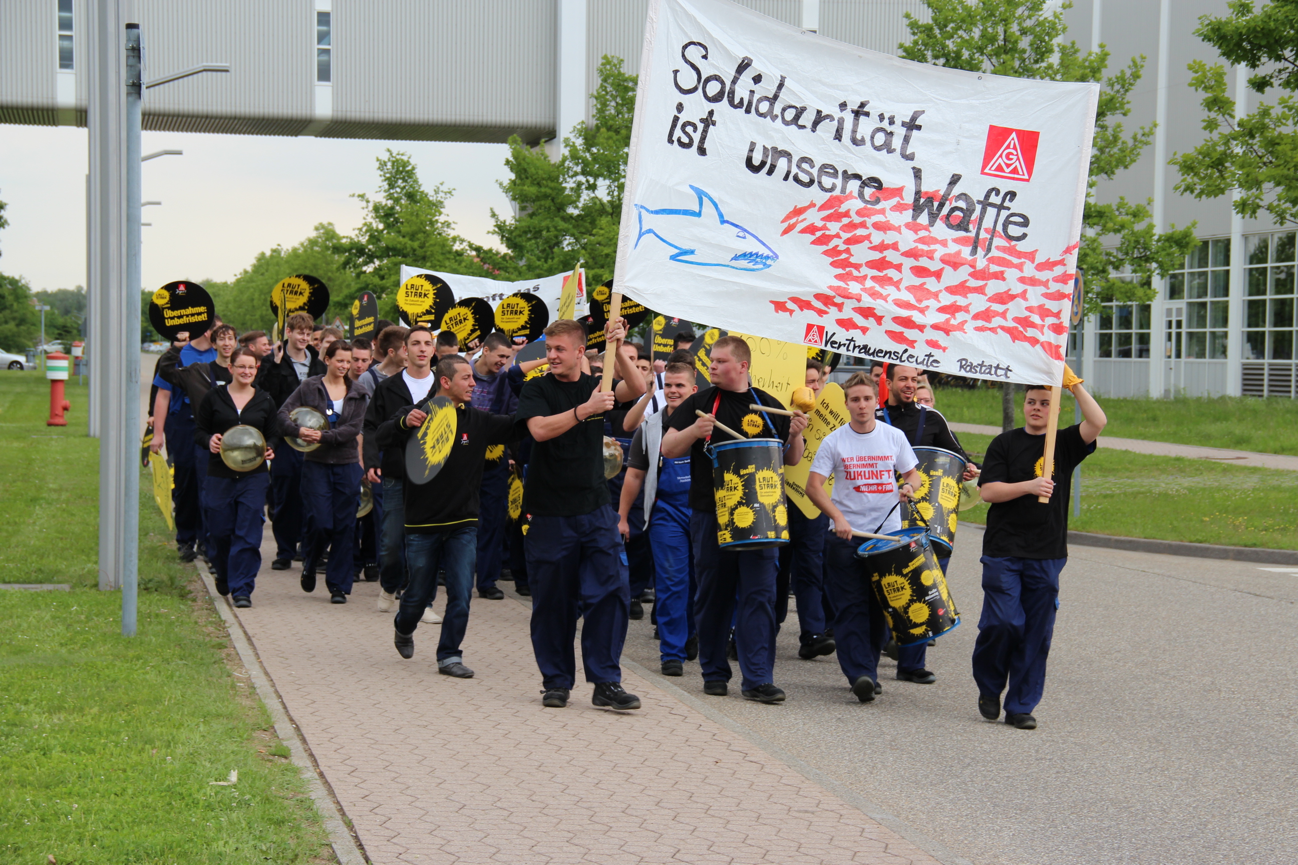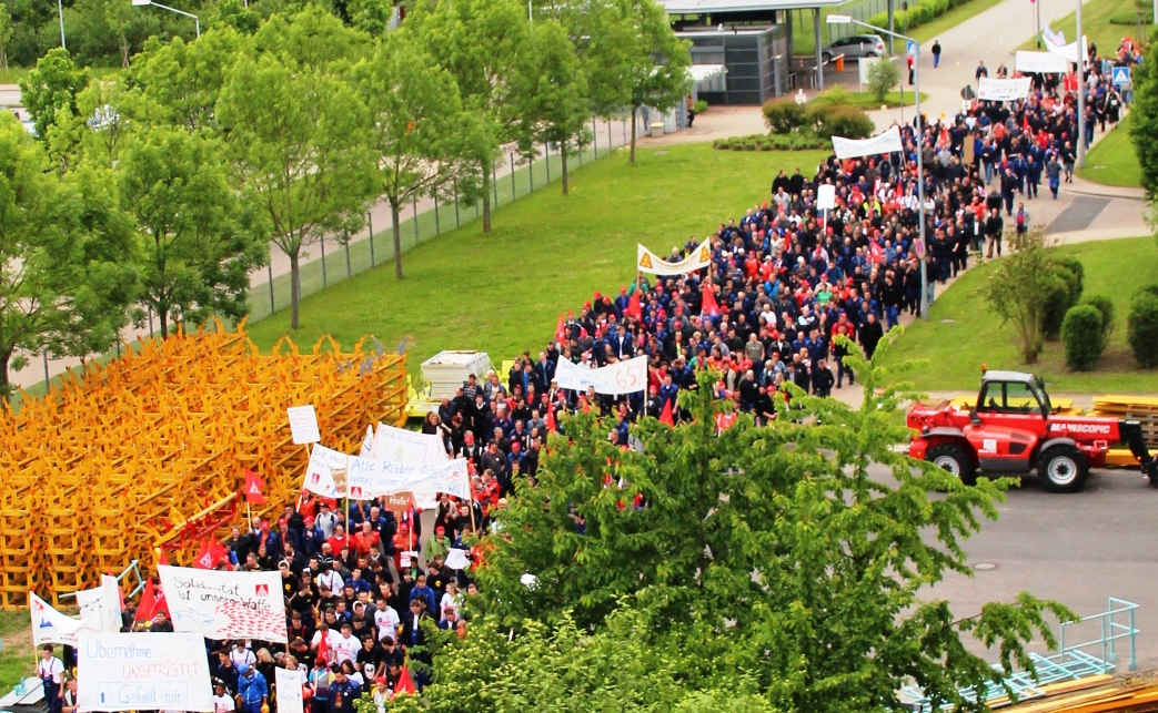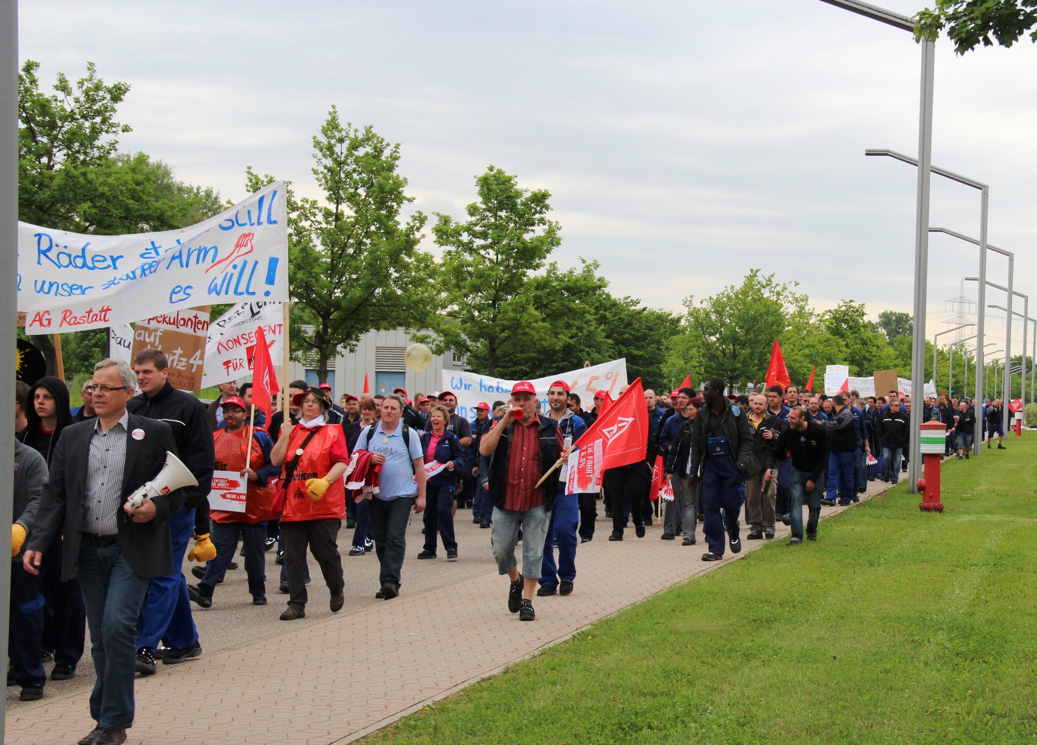 In einem eindrucksvollen Demonstrationszug zogen heute die Beschäftigten des Mercedes-Benz Werk Rastatt die rund 2km lange Mercedesstrasse entlang.