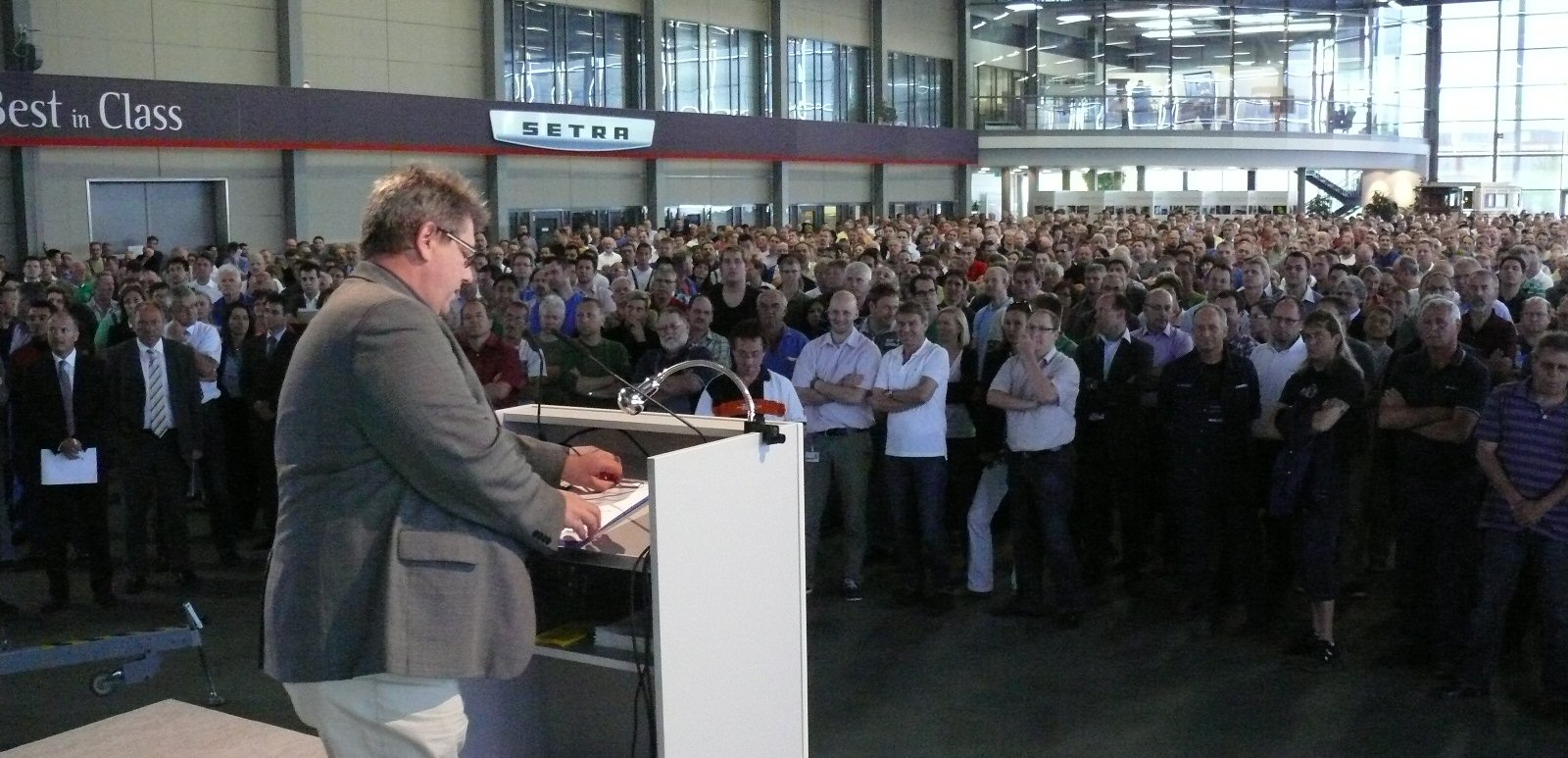 Auf Informationsveranstaltungen in den beiden Buswerken Mannheim und Neu-Ulm informierten Geschäftsführung und Betriebsrat, wie die Wettbewerbsfähigkeit der deutschen Produktionsstandorte gestärkt und ihre Zukunft gesichert wird.