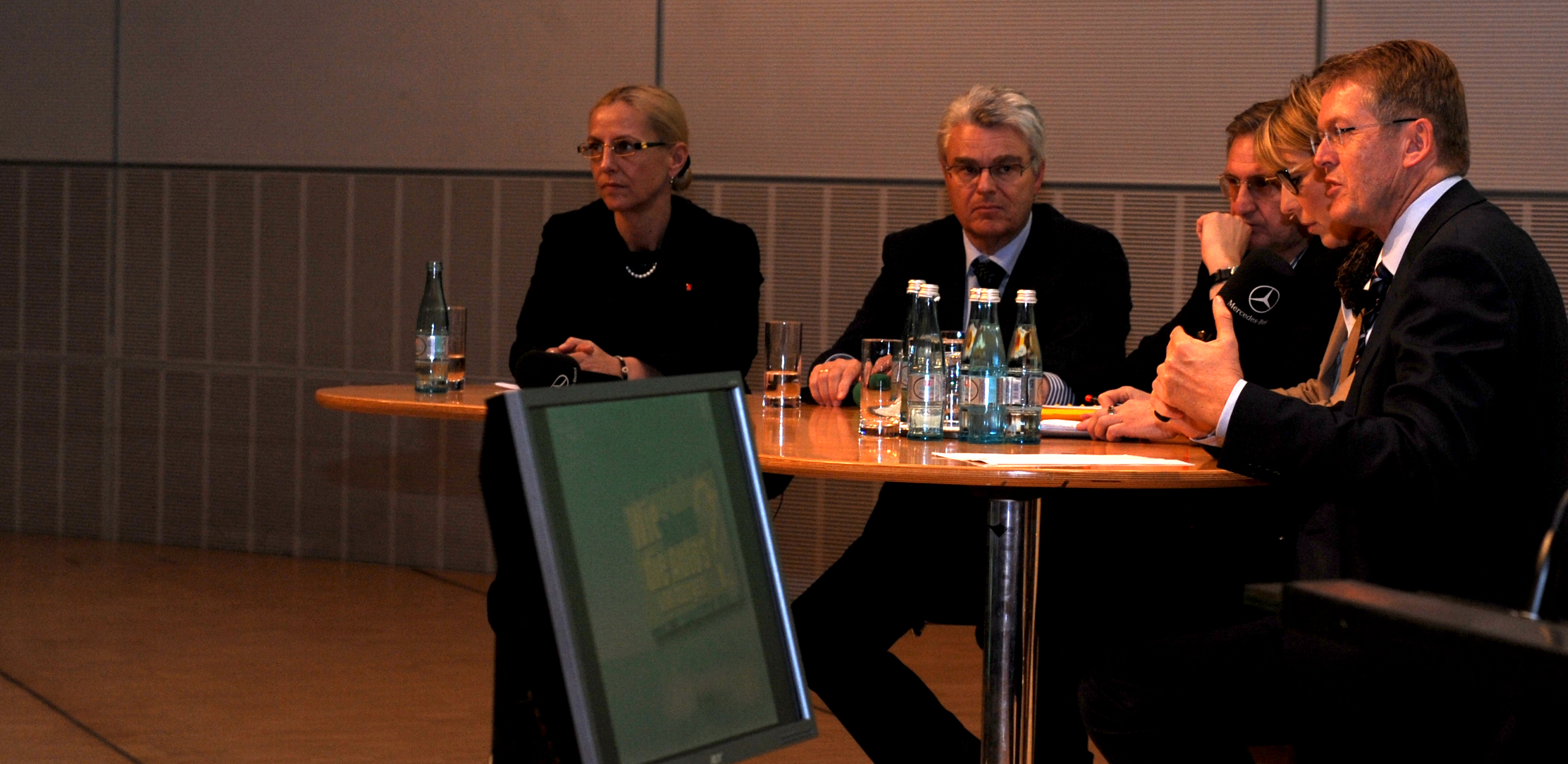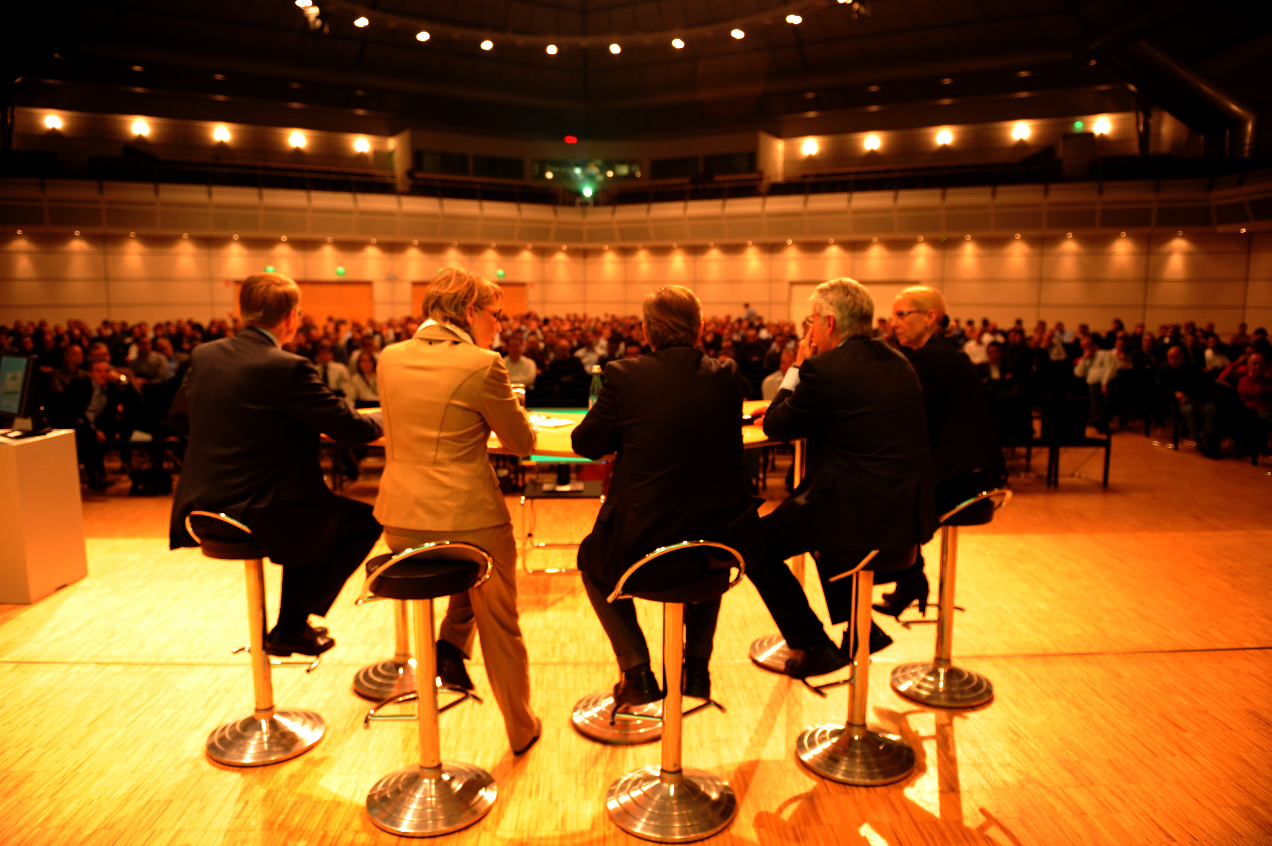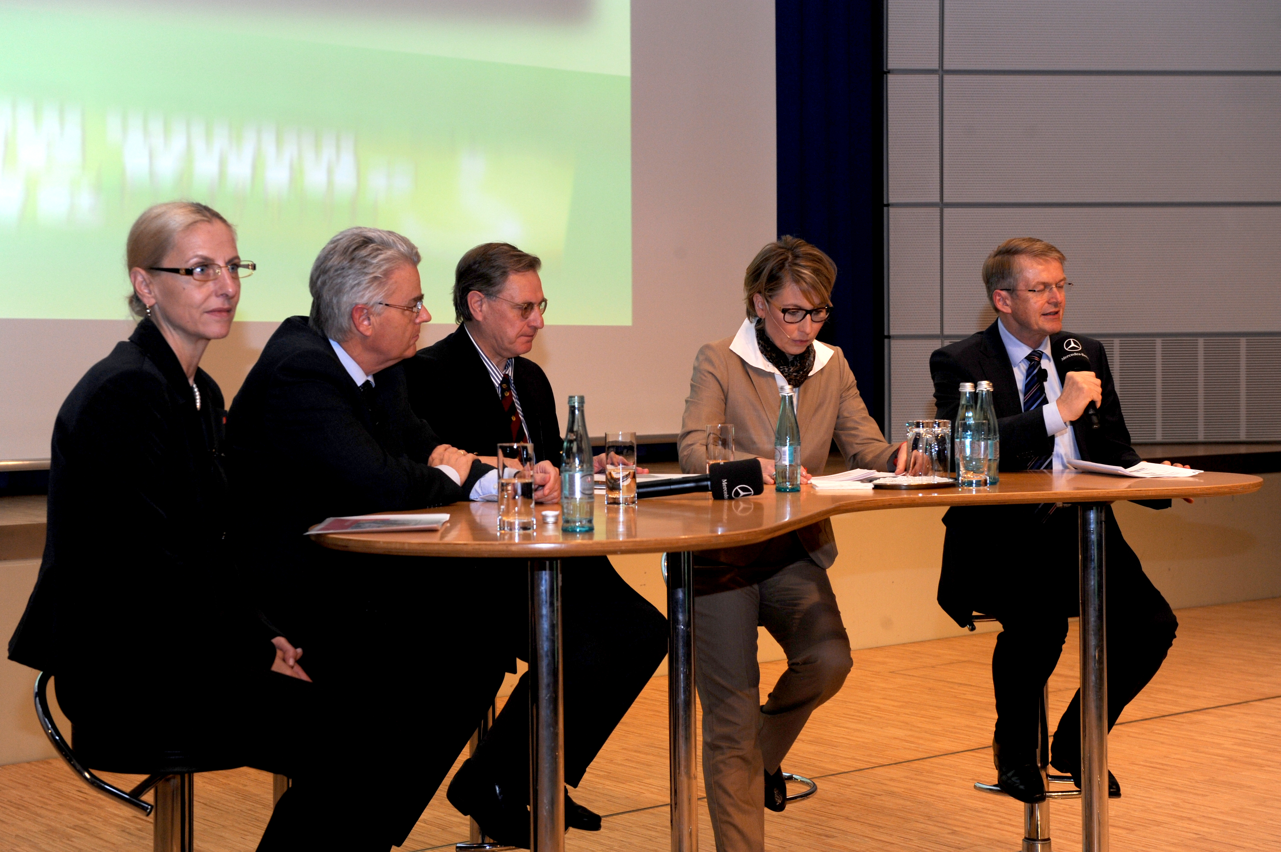 Für den Aspekt "technologischer Wandel" hin zu alternativen Antrieben hatte der Betriebsrat das entscheidende Vorstandsmitglied - Herrn Prof. Dr. Thomas Weber, verantwortlich für Konzernforschung und die Entwicklung der MBC - als Referent und Diskutant eingeladen. Die Sicht der Wissenschaft brachte Prof. Dr. Horst E. Friedrich, Leiter des Instituts für Fahrzeugkonzepte beim Deutschen Zentrum für Luft- und Raumfahrt, ein. Babette Fröhlich, Leiterin Politische Planung beim IG Metall-Vorstand, repräsentierte als Mitglied des Redaktionsteams der Nationalen Plattform Elektromobilität die politischen Akteure auf diesem Feld. Sie warf einen Blick auf die industriepolitischen und beschäftigungspolitischen Aspekte des technologischen Wandels. Die Runde wurde moderiert von der Hörfunkjournalistin Uschi Götz. Das Publikum - rund 500 Beschäftigte aus dem Werk Sindelfingen erlebte an diesem Abend, wie sich die Experten aus ihren unterschiedlichen Blickwinkeln den Thema näherten.