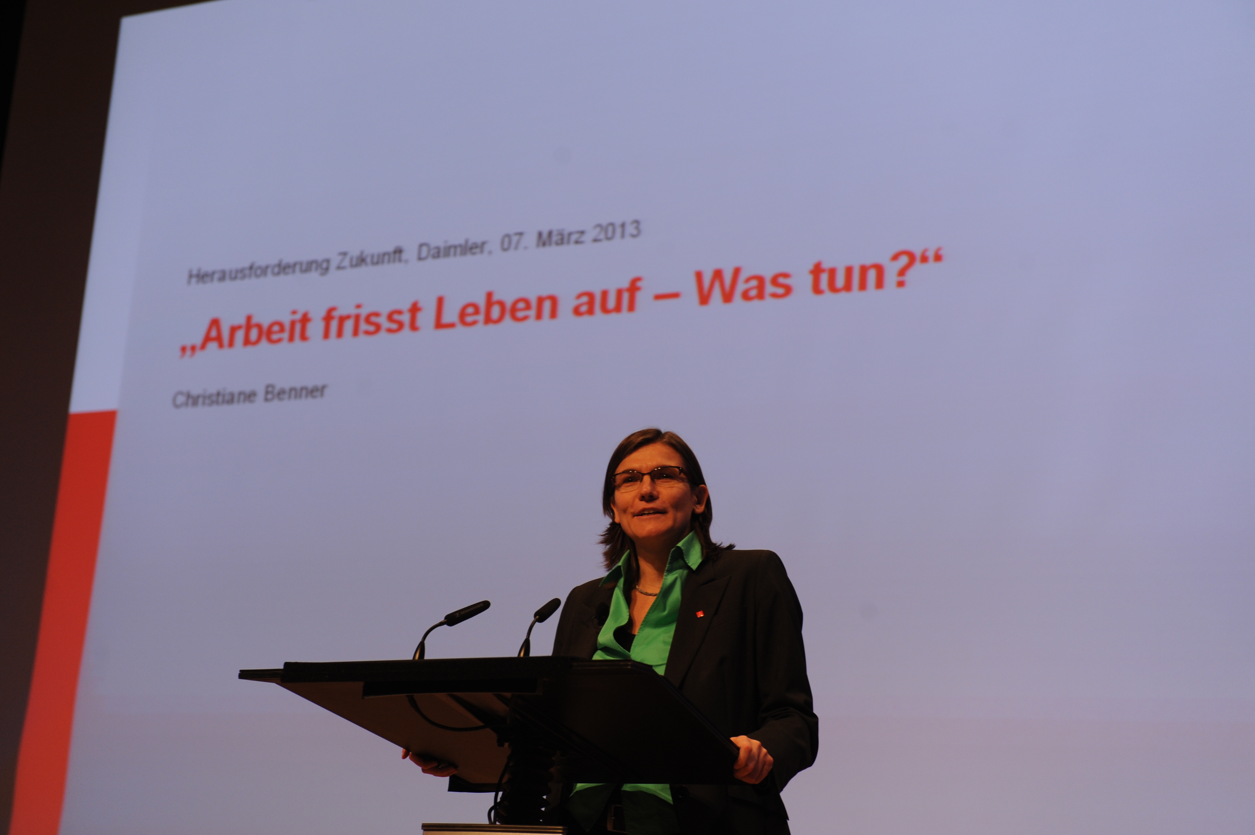 Christiane Benner legte den Fokus ihres Vortrags auf die Doppelbelastung aus Familie und Beruf, die immer noch in erster Linie auf den Schultern Frauen liege. Sie verwies auf die unterschiedlichen Lebensphasen, mit jeweils anderen Bedürfnissen und forderte passgenauere Lösungen für diese zu finden. "Es muss möglich sein, nicht nur einen Anspruch auf Teilzeit zu haben, sondern auch einen Anspruch darauf, die Teilzeit wieder verlassen zu können."