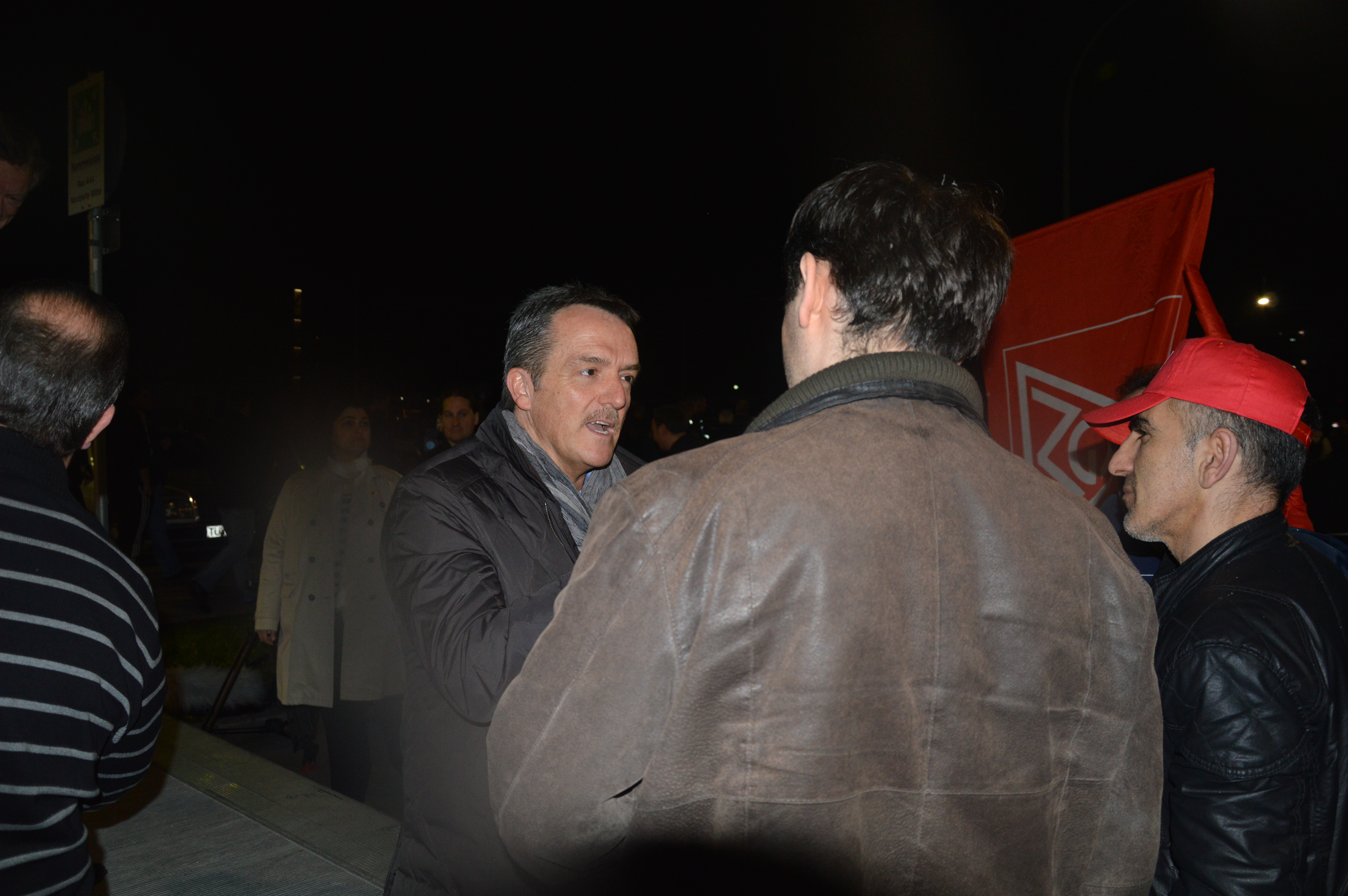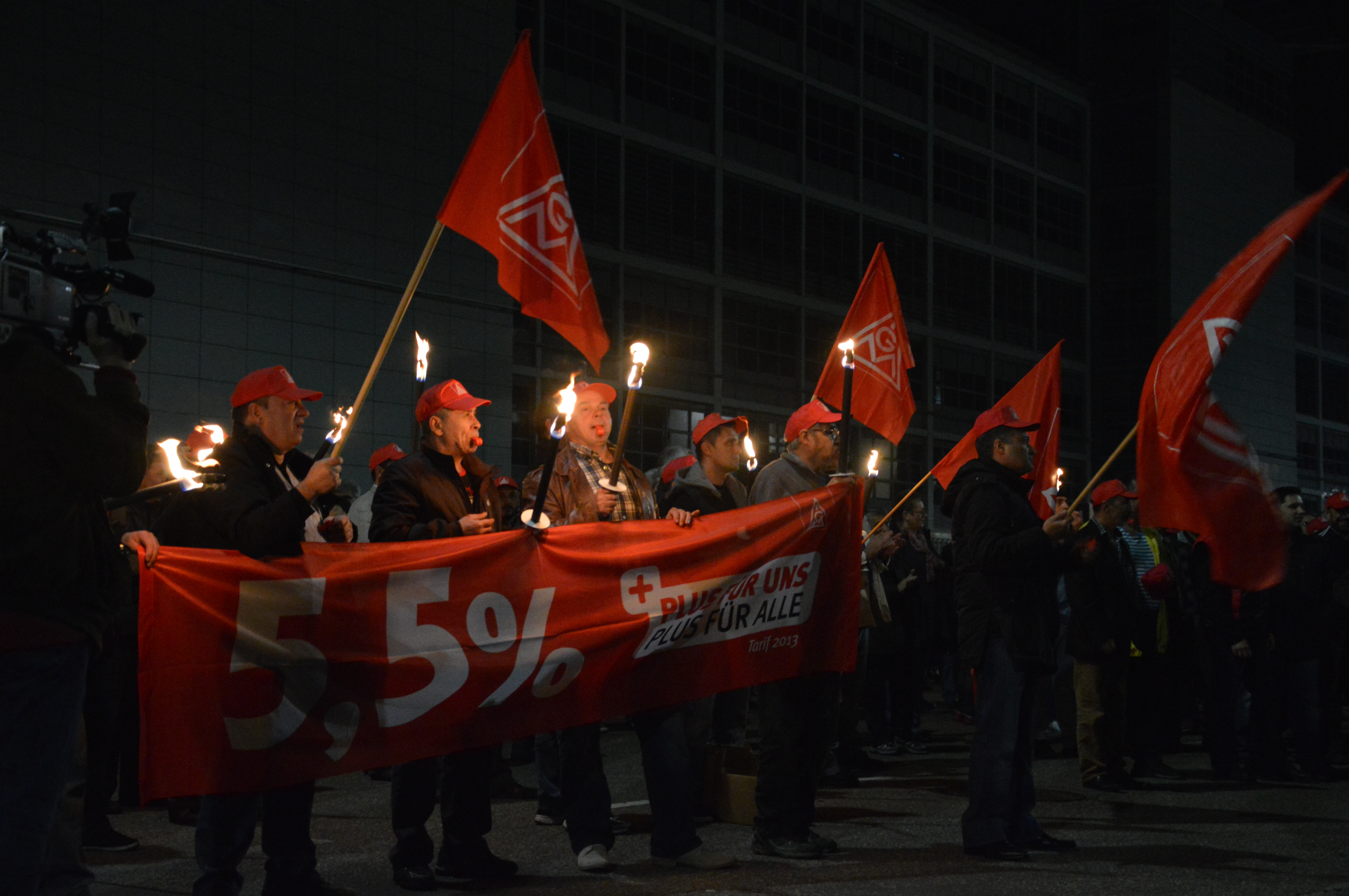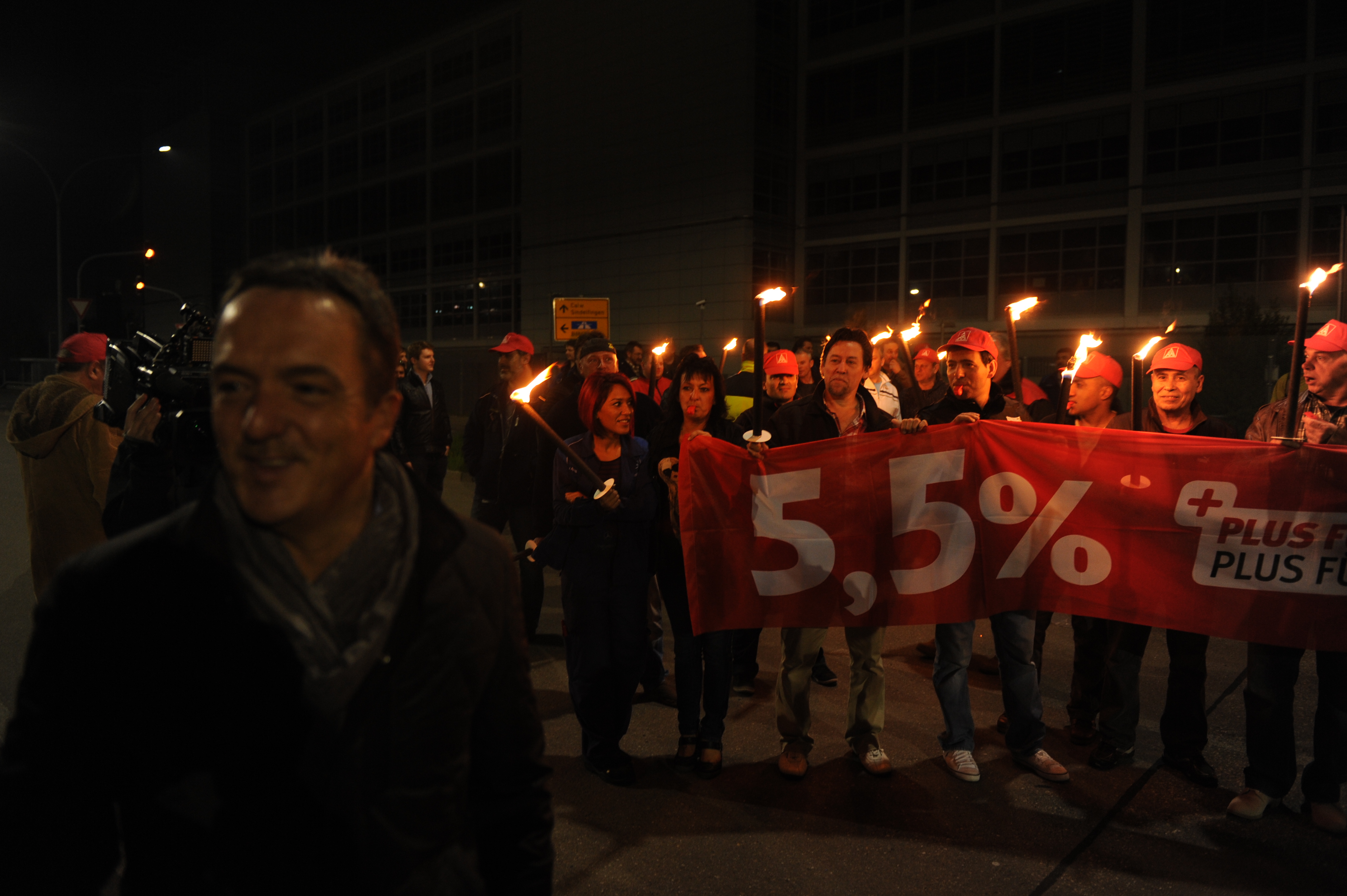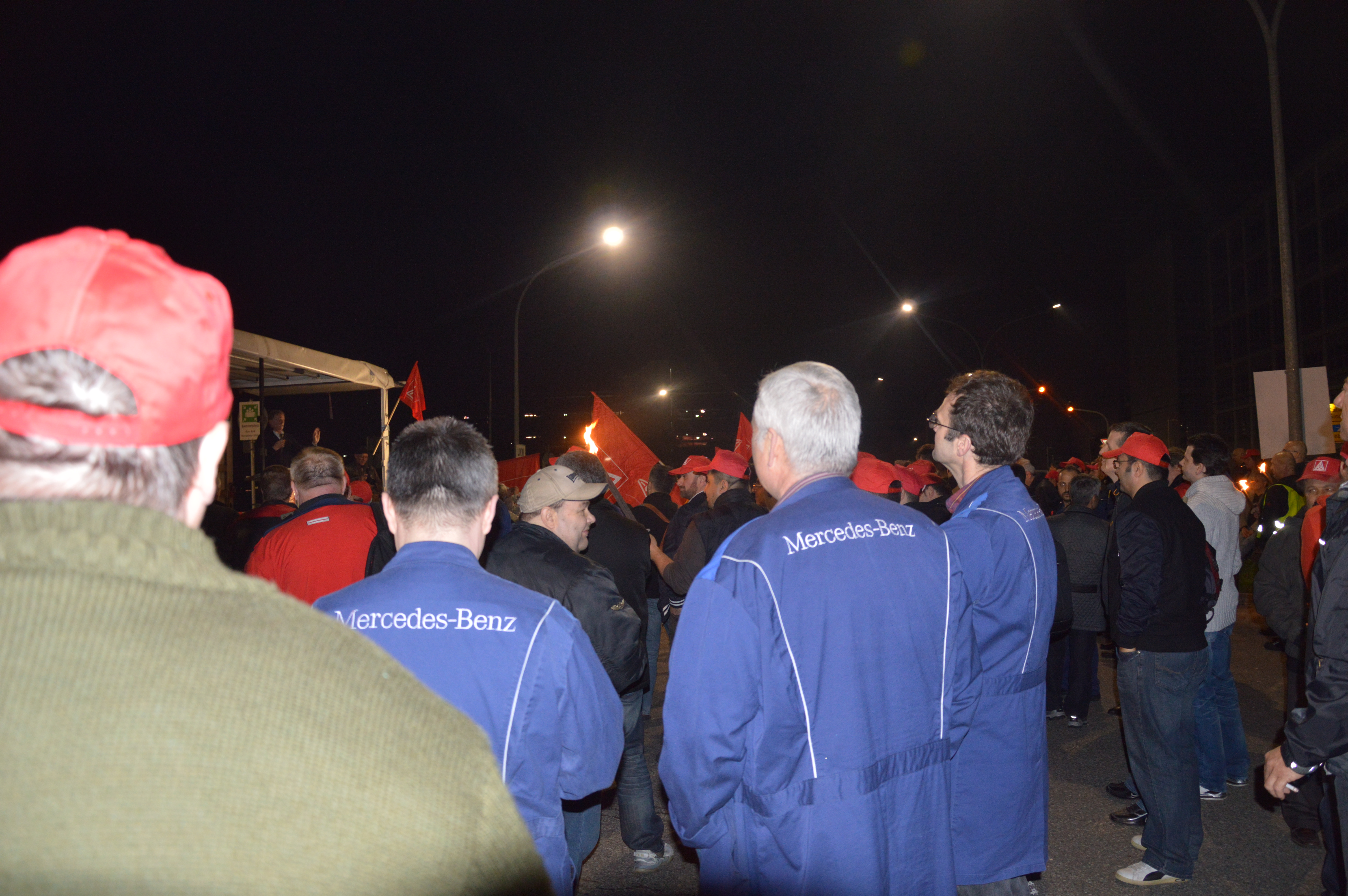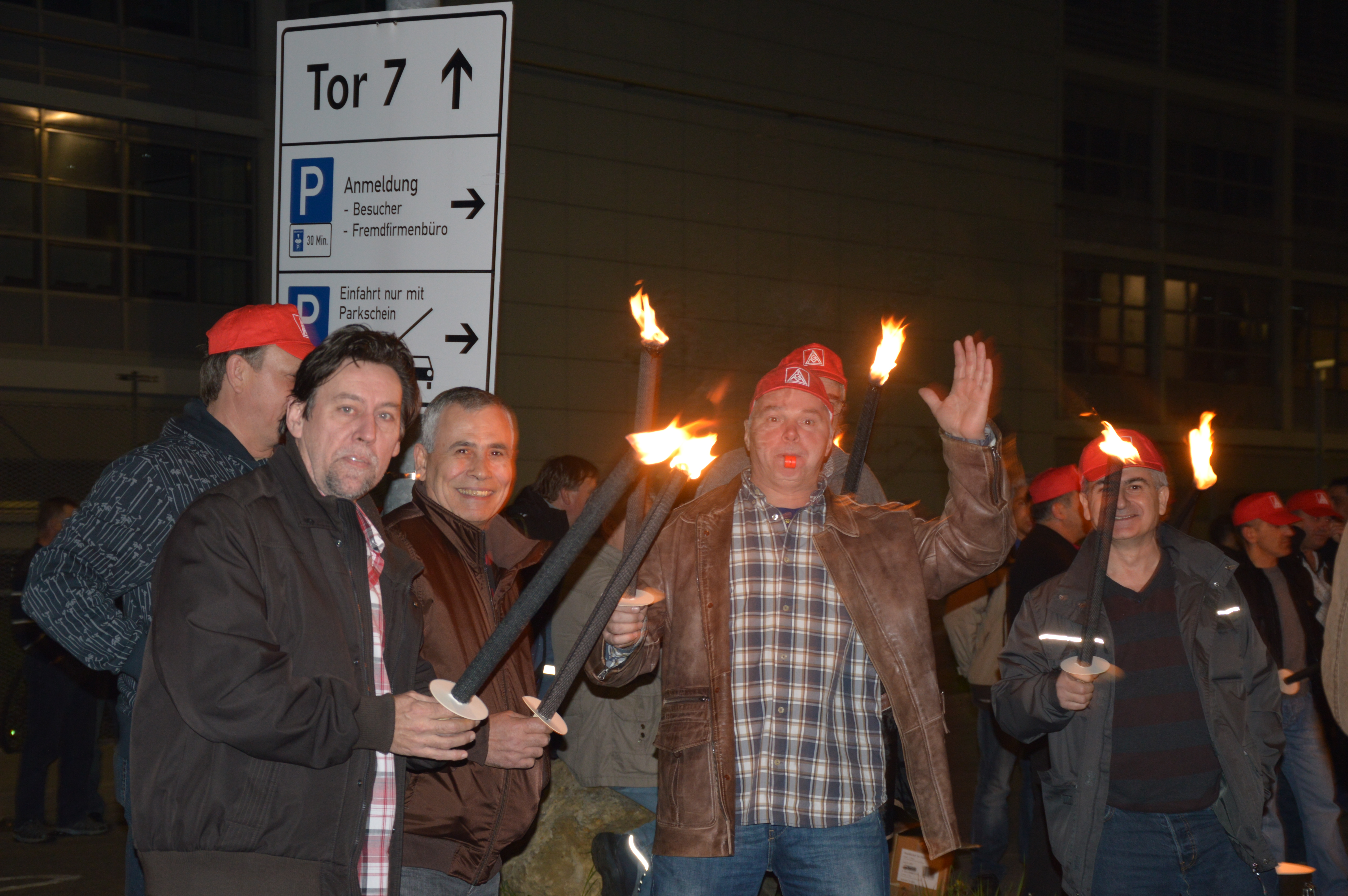 Gestern noch feierten 1500 Metaller in Sindelfingen ihren Tag der Arbeit und gingen für faire Löhne auf die Straße. Heute ließen sie Taten sprechen. Um 3.30 verließen ca. 500 Beschäftigte der Nachtschicht ihren Arbeitsplatz, um mit Fackeln vor das Werkstor zu ziehen. Das Angebot der Arbeitgeber wurde lautstark und empört zurückgewiesen.