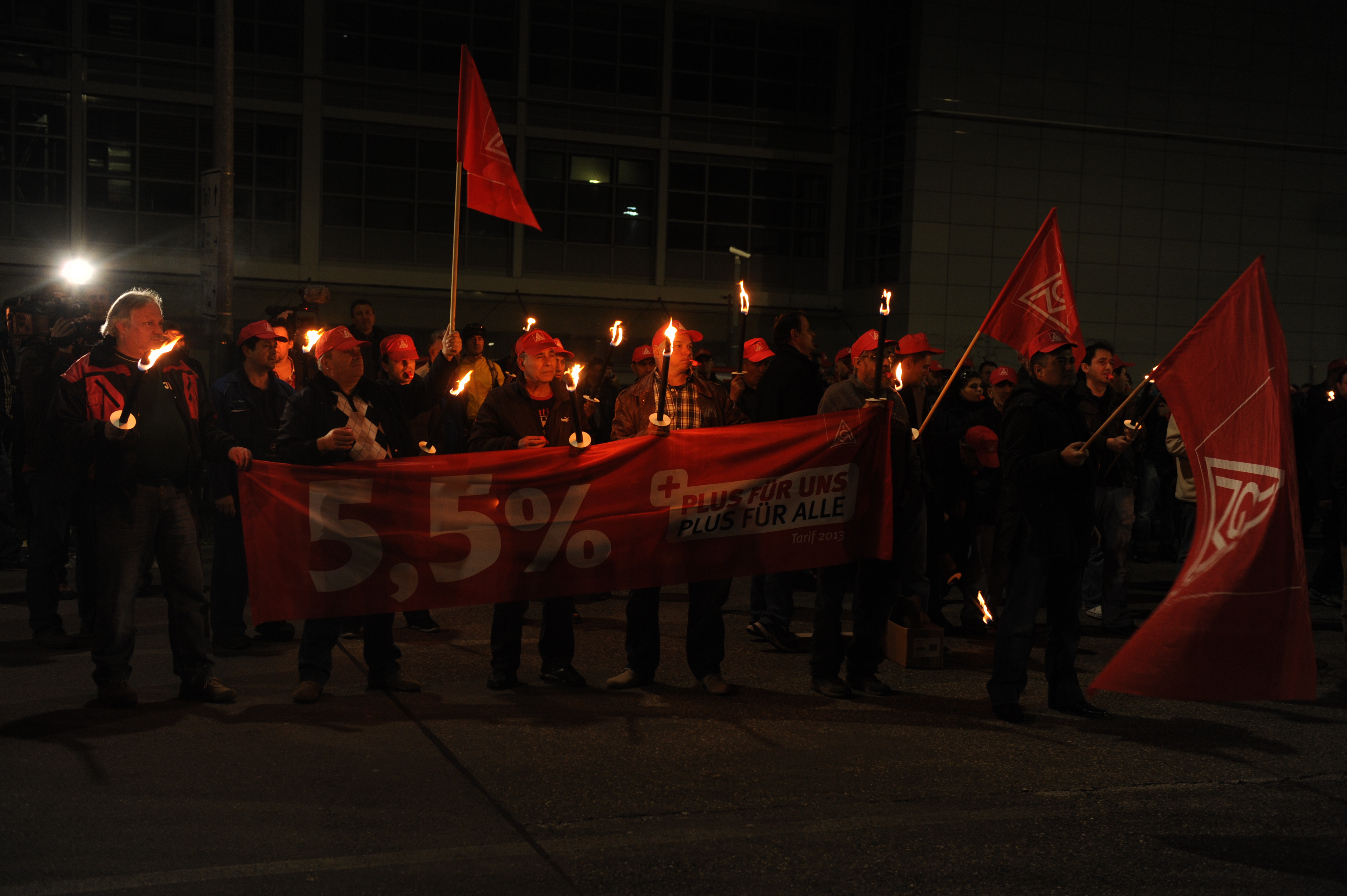 500 Beschäftigte der Nachtschicht bei Daimler in Sindelfingen folgten dem Aufruf ihrer Gewerkschaft und beteiligten sich am Warnstreik. Damit eröffnete die IG Metall in Baden-Württemberg die heiße Phase der Tarifrunde 2013.