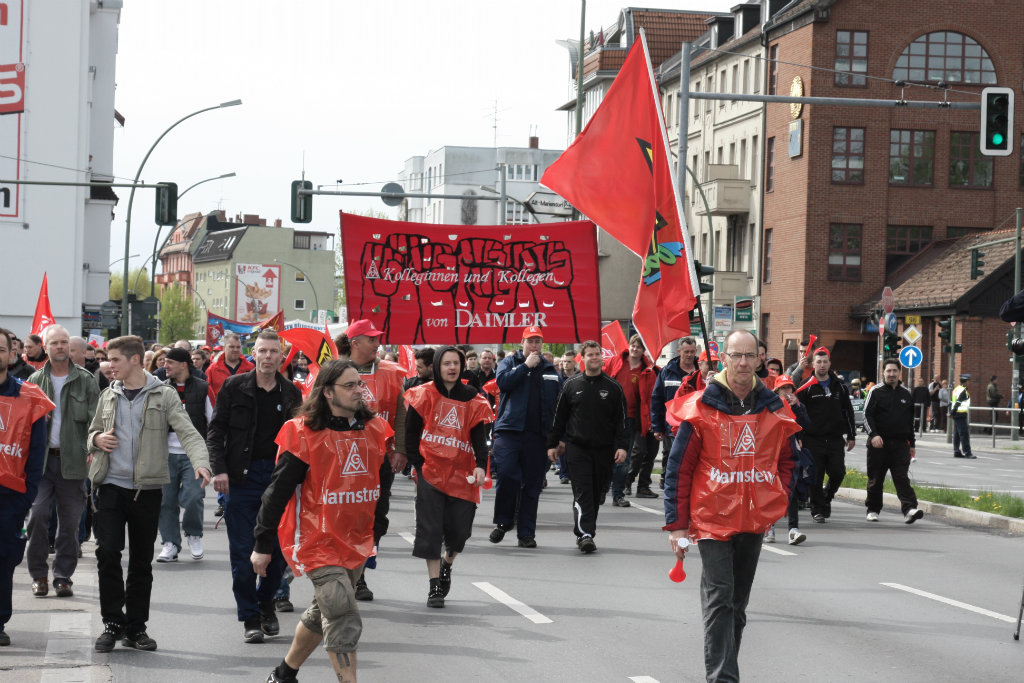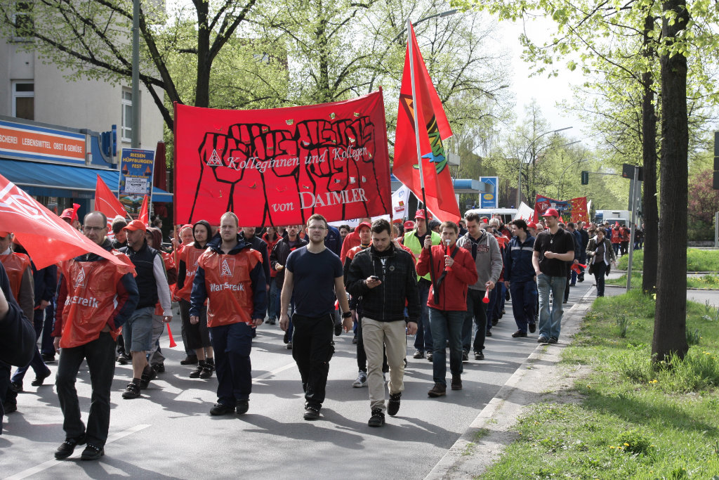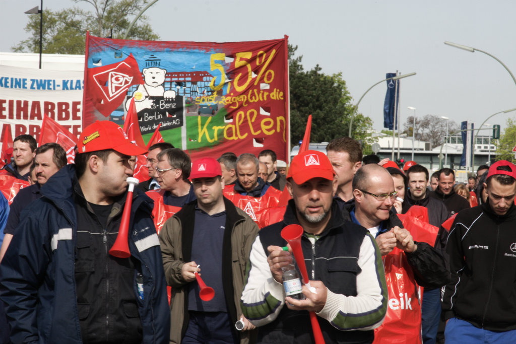 Kraftvoll wird die Forderung der IG Metall nach 5,5 Prozent mehr Geld, nach dem Ende der Friedenspflicht, von den Kolleginnen und Kollegen in Berlin unterstützt. Ca. 500 Kolleginnen und Kollegen von Werk Berlin - unterstützt von unseren Auszubildenden und vielen Leiharbeitern und Werksverträglern beteiligten sich an dem Warnstreik. Auf dem Weg zur zentralen Kundgebung am Mariendorfer Damm in Alt-Mariendorf schlossen sich Kolleginnen und Kollegen aus folgenden Betrieben an: Bosch Sicherheitssysteme, GE Energy Power Conversion, Häfele Berlin, SKF Werk, Paul Hettich, Procter & Gamble und Thales TS.