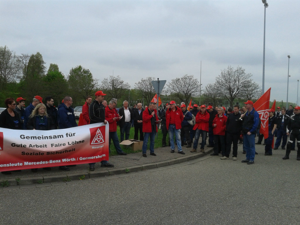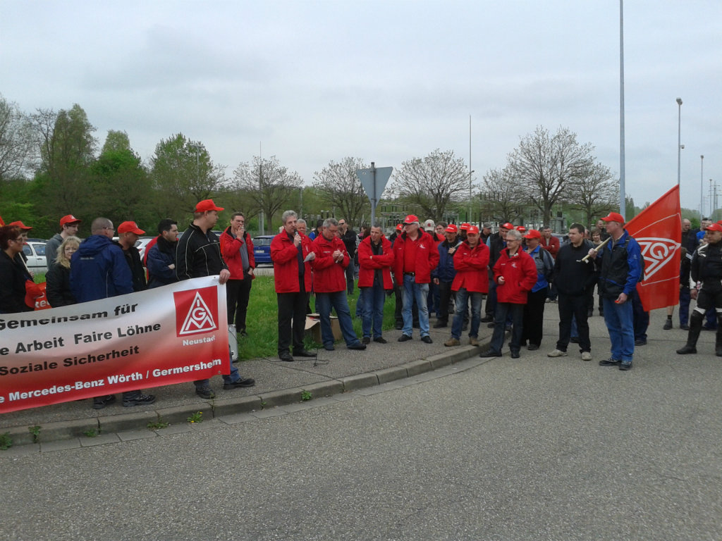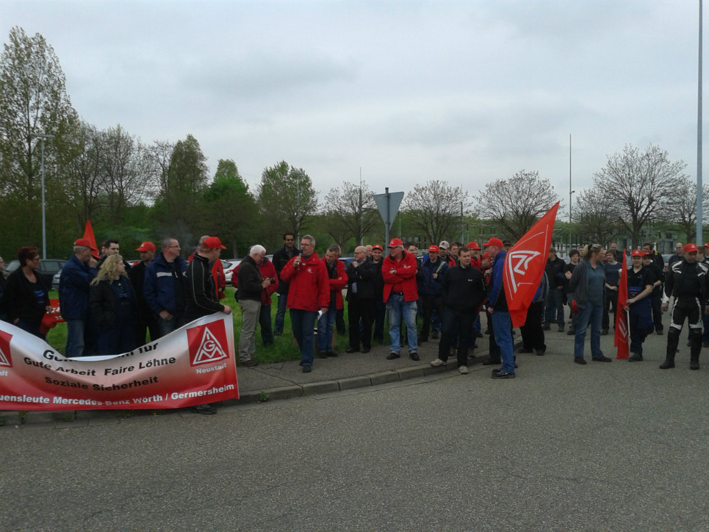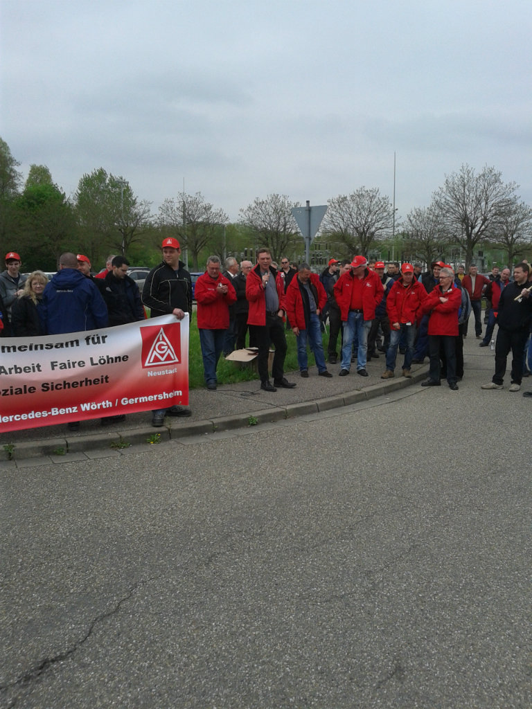 Die Streikwelle bei Mercedes-Benz setzt sich fort. Am 3. Mai traten rund 500 Beschäftigte im Global Logistics Center Germersheim in den Warnstreik. Die anwesenden Gewerkschafts- und betrieblichen Arbeitnehmervertreter kritisierten das Angebot der Arbeitgeberseite scharf und forderten die Beschäftigten auf, weiter Druck auf die Arbeitgeber auszuüben.