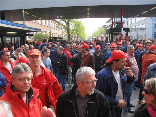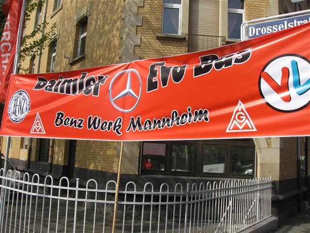 Mercedes-Benz und EvoBus in Mannheim die Arbeit niedergelegt und sich vor dem Tor 1 versammelt, um für mehr Geld zu demonstrieren.