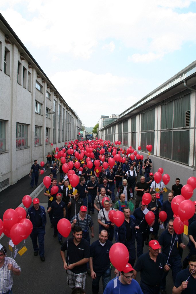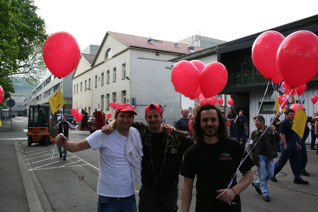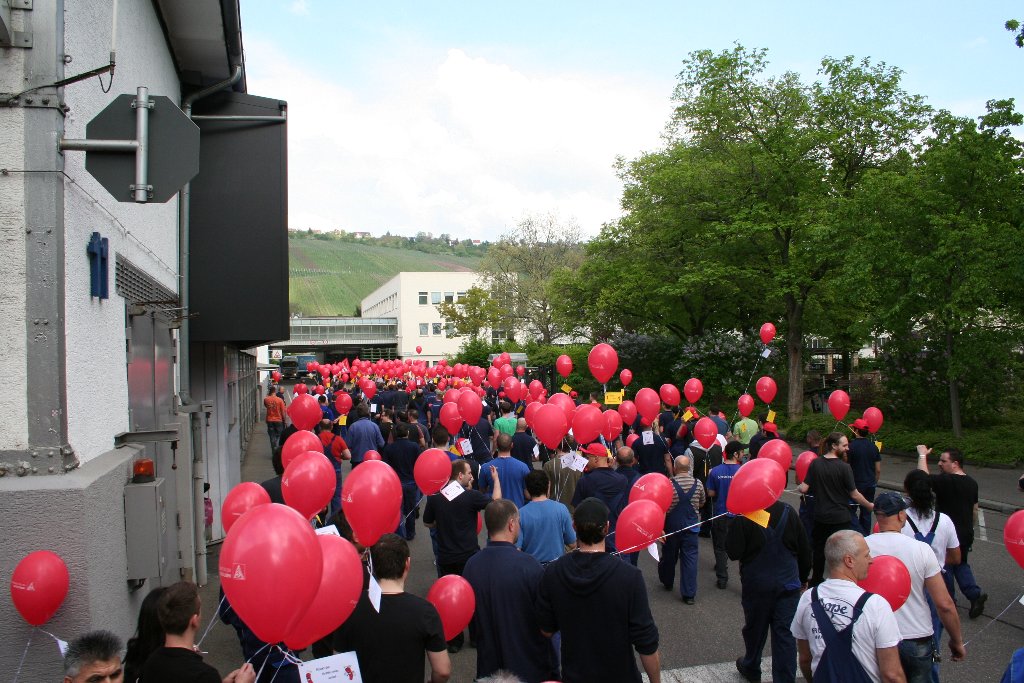 Bei den Warnstreiks haben die Kolleginnen und Kollegen 1000 rote Luftballons mit Postkarten in den Himmel steigen lassen. Auf den Postkarten steht die Botschaft der Beschäftigten an den Arbeitgeberverband Südwestmetall: "Rückt die Kohle raus, sonst bleiben wir zu Haus!"