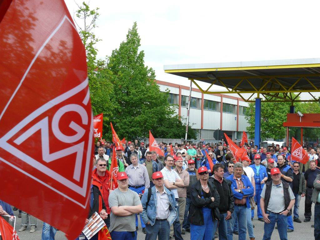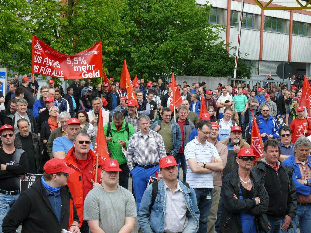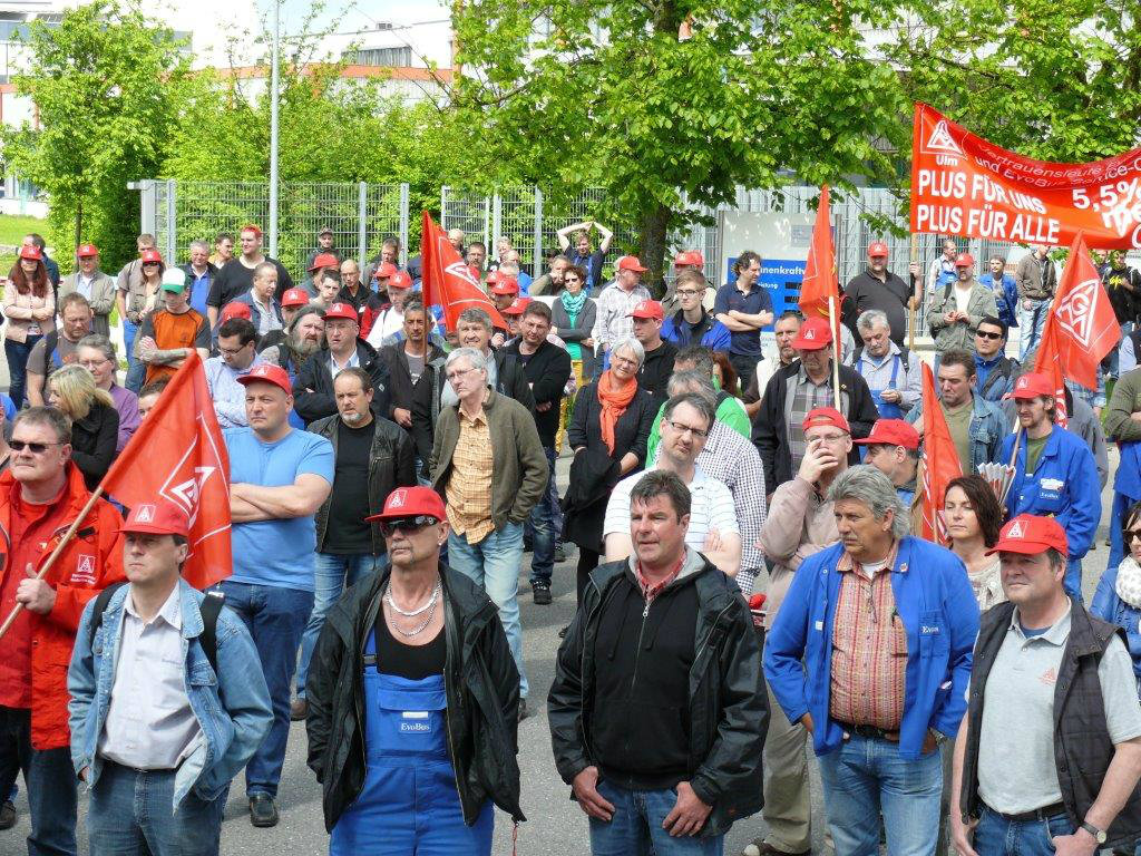 Am 14. Mai legen ca. 2000 Beschäftigte bei EvoBus in Neu-Ulm die Arbeit nieder. Die Produktion stand still.