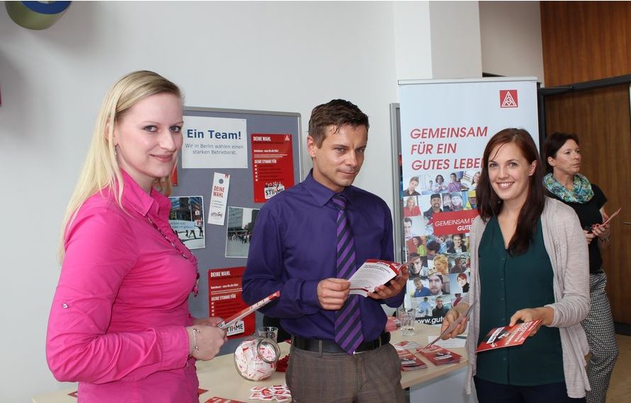 In Vorbereitung auf die Betriebsratswahl Anfang 2014 hatten die Beschäftigten in der Zeit von 11.30 Uhr bis 14.30 Uhr Gelegenheit, sich im Foyer über die Funktion der betrieblichen Interessenvertretung ein genaueres Bild zu machen. "Das Interesse an den Aufgaben, Rechten und Pflichten eines Betriebsrates seitens der Belegschaft war sehr groß. Viele Beschäftigte haben unser Angebot genutzt", berichtete Vanessa Krieg, IG Metall Berlin.