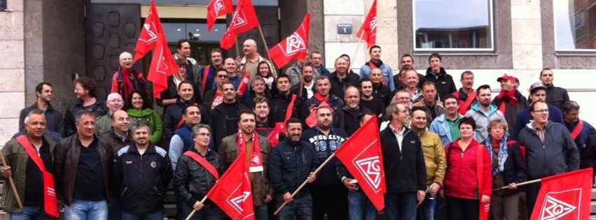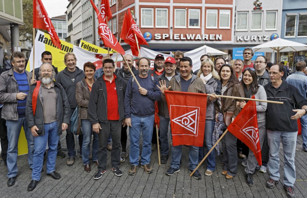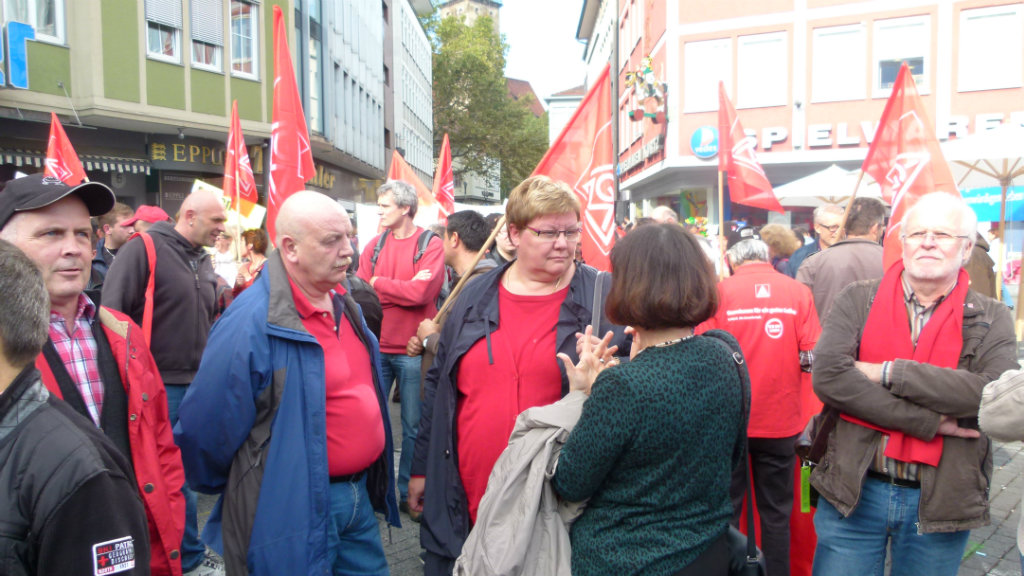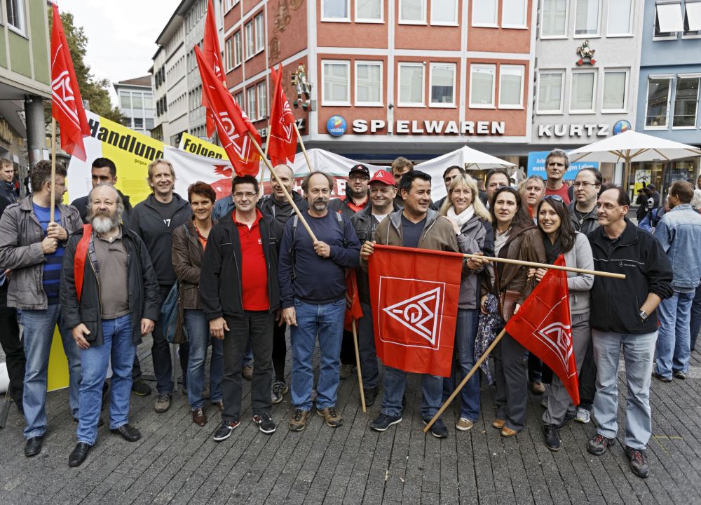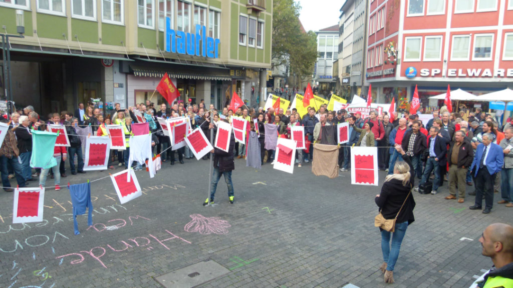 Sindelfingen. Am 7. Oktober, dem Welttag für menschenwürdige Arbeit setzten gestern Gewerkschafter weltweit ein Zeichen gegen prekäre Beschäftigung. Auch in Stuttgart gingen unter dem Motto "Wir lassen uns nicht spalten" viele Menschen auf die Straße, davon ca. 200 Beschäftigte aus den Stuttgarter Daimler-Betrieben. Diese setzten sich gemeinsam mit Kollegen und Kolleginnen aus dem Einzelhandel sowie aus anderen Metall- und Elektrobetrieben für starke Tarifverträge und gegen die gängige Praxis des Lohndumpings ein.