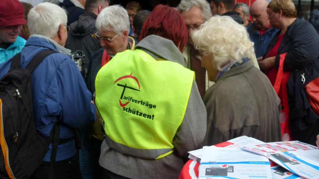 Er argumentierte, dass die im Einzelhandel gezahlten Dumpinglöhne auch das momentan noch recht gute Lohnniveau im Metall- und Elektrobereich bedrohen würden und leitete so gekonnt zum momentan sehr präsenten Thema Werkverträge über, die er als einen "Angriff auf unsere Tarifverträge" scharf anging. Die IG Metall fordere Leiharbeit und Werkverträge regulieren und einen gesetzlichen Mindestlohn einführen. Wer ins Bundesarbeitsministerium einziehen will, muss faire und sichere Jobs schaffen - so die Botschaft am heutigen Welttag für menschenwürdige Arbeit.