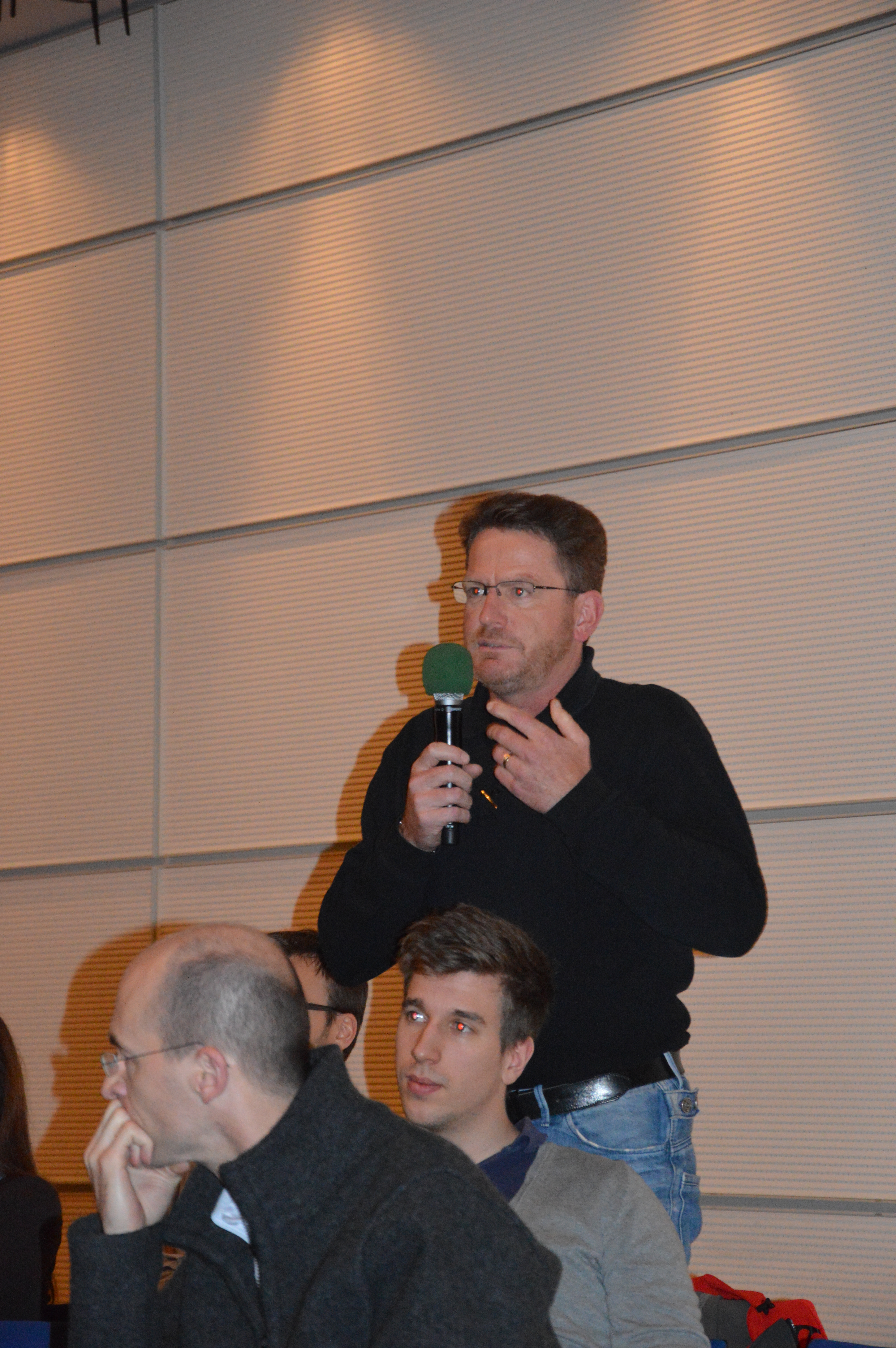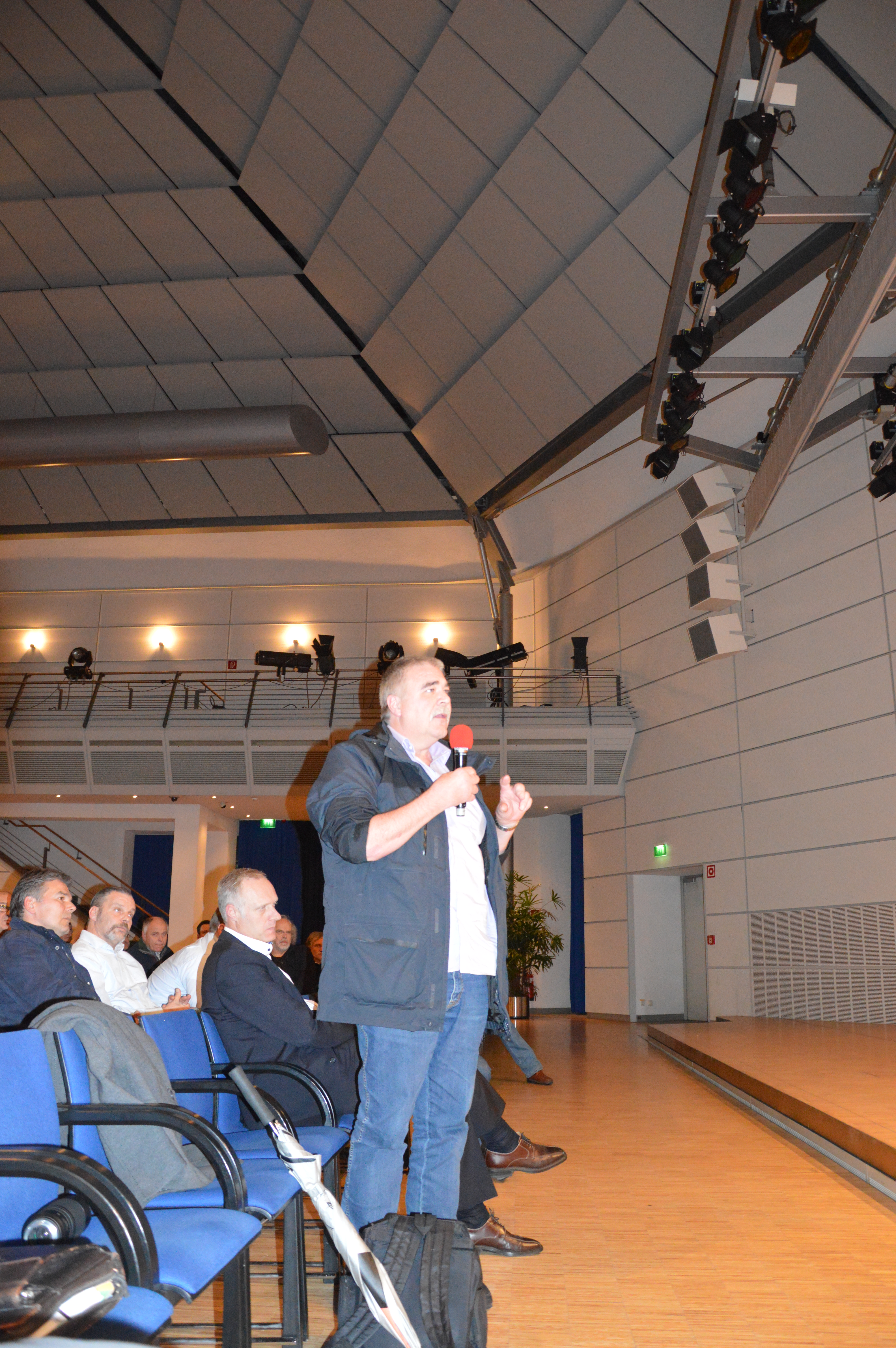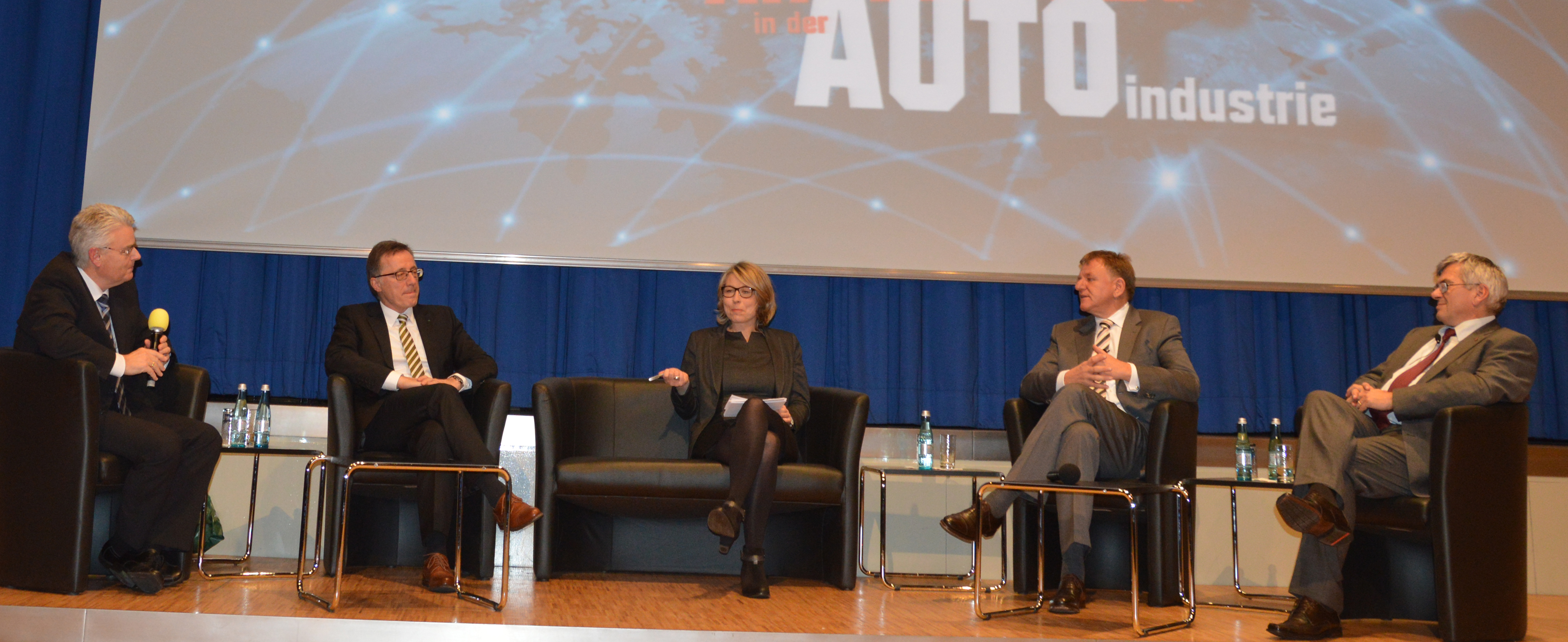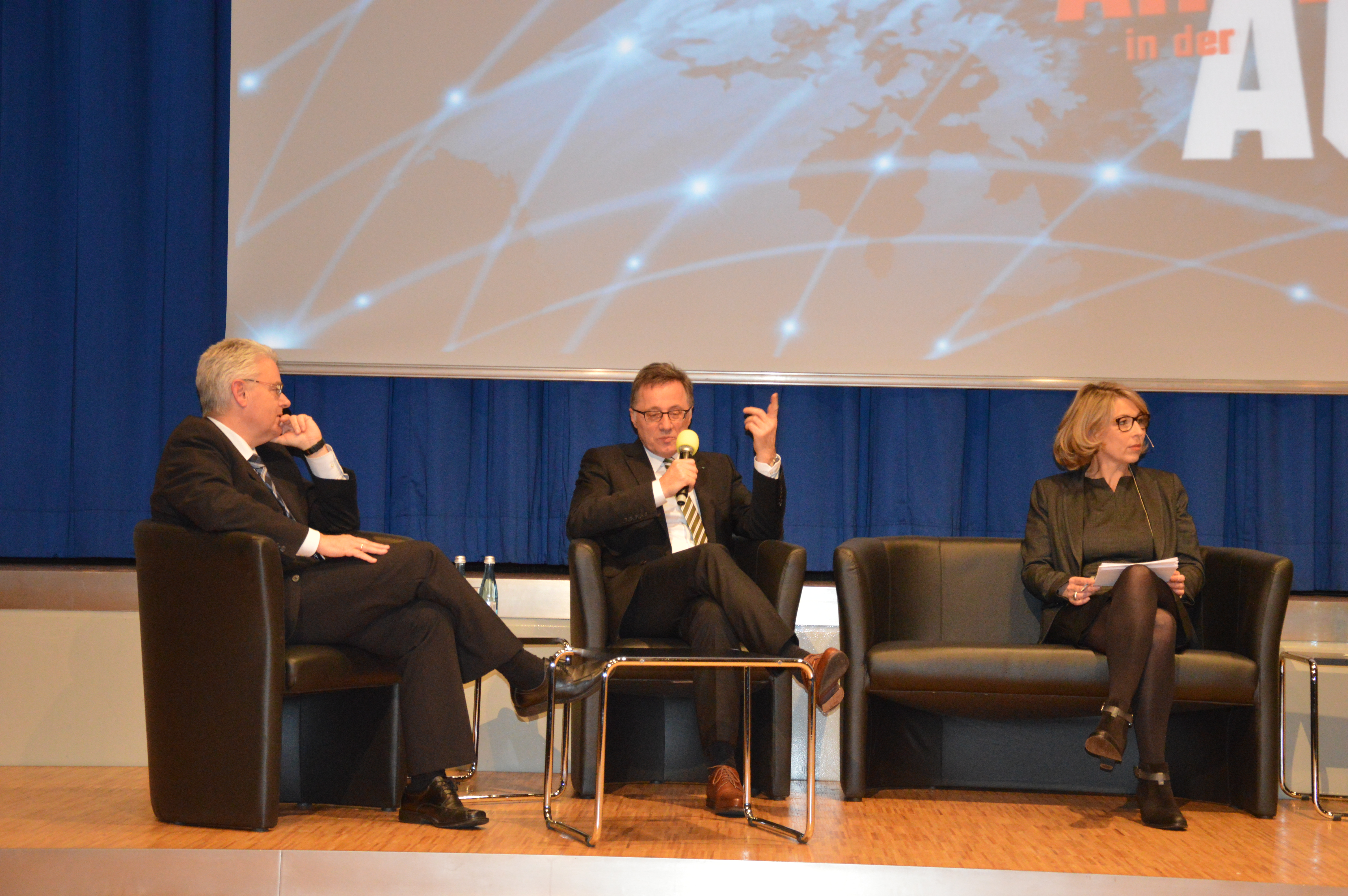 Im Anschluss an die Impulsreferate folgte die Podiumsdiskussion. Die drei Redner sowie Betriebsratsvorsitzender Erich Klemm stellten sich den Fragen von Uschi Götz und denen des Publikums.