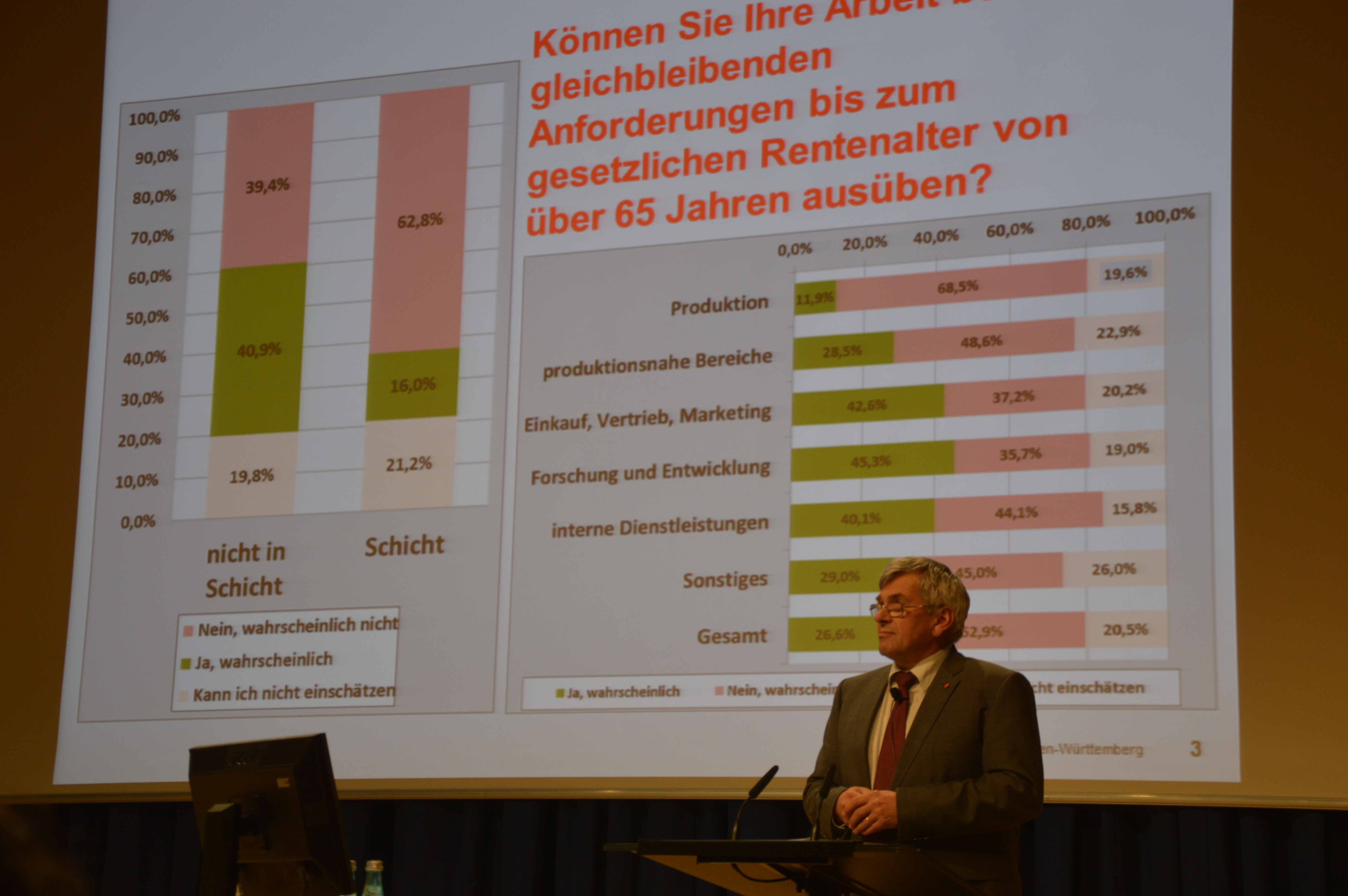 Direkt auf die Wünsche und Ideen der Beschäftigten ging der Baden-Württembergische IG Metall-Bezirksleiter Jörg Hofmann ein. Er stellte in seinem Impulsreferat die zentralen Ergebnisse der in diesem Jahr von der IG Metall durchgeführten Beschäftigtenbefragung: "Arbeit sicher und fair"vor.