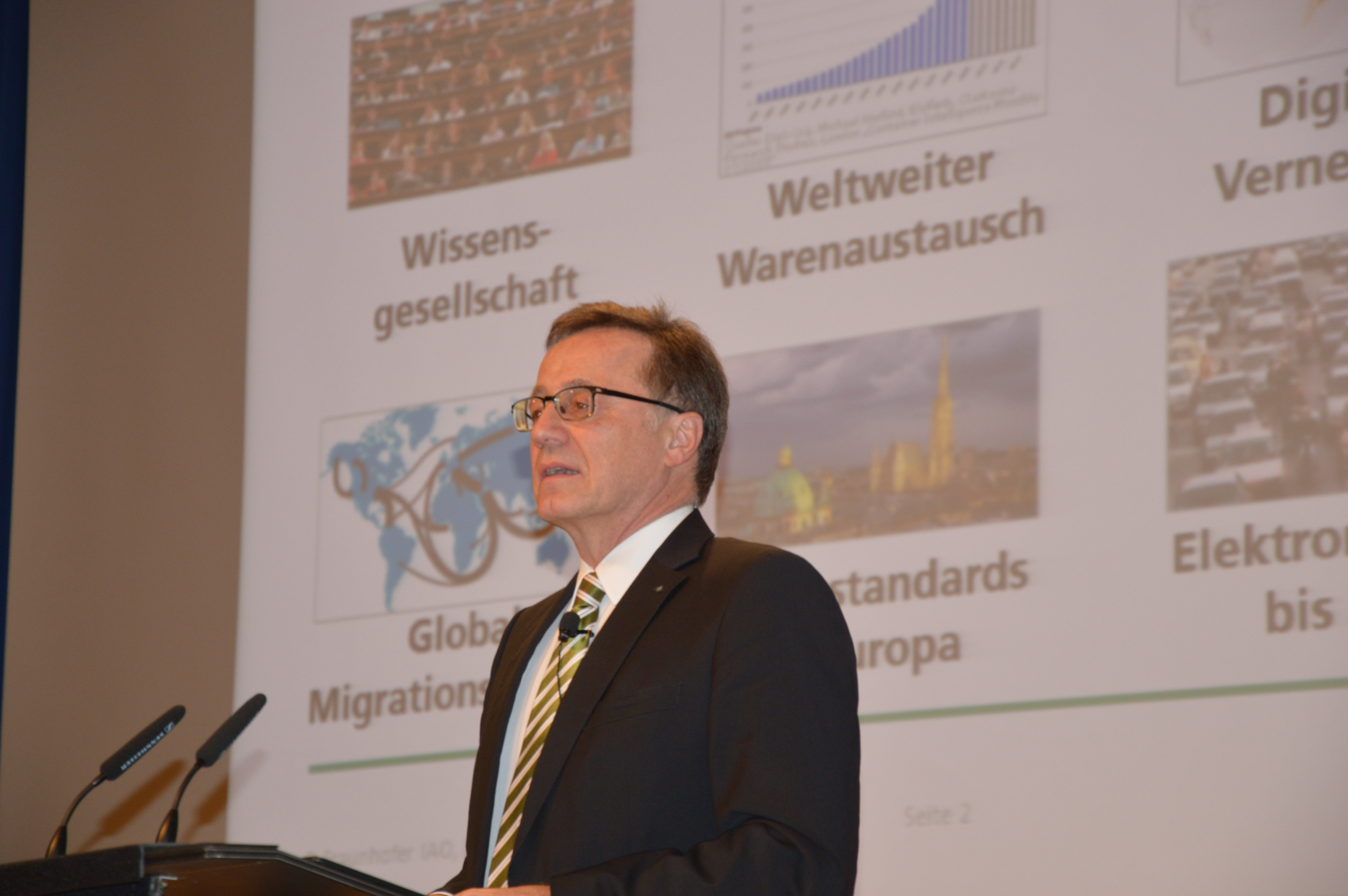 Prof. Dr.-Ing. Wilhelm Bauer vom Fraunhofer-Institut für Arbeitswirtschaft und Organisation IAO widmete sich aus Sicht der Wissenschaft den relevanten globalen Megatrends bis 2050 und ihren Auswirkungen auf die Produktionsarbeit der Zukunft. Die Produktion sei nach Studien des Statistischen Bundesamtes einer der zentralen Faktoren für Wertschöpfung und Beschäftigung in Deutschland.