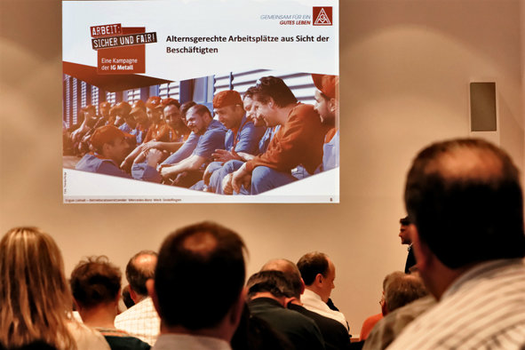 Zitat von dem Betriebsratsvorsitzenden Ergun Lümali beim Automobiltag in Stuttgart:"Wir müssen weg vom Leitbild der olympiareifen Belegschaften, die in den Montagehallen immer schneller und immer mehr arbeiten sollen. Das wäre nicht nur ungerecht gegenüber Jungen und Älteren, sondern es wäre aus meiner Sicht auch die falsche Form des Wirtschaftens. Eine oft zitierte Grundidee der Gewerkschaft lautet: Die Wirtschaft ist für den Menschen da, nicht der Mensch für die Wirtschaft. Übersetzt auf unser Thema heißt das: Nicht die älter werdenden Menschen müssen sich mit den Arbeitsbedingungen abfinden, sondern die Arbeitsplätze müssen so gestaltet werden, dass Menschen gesund das Rentenalter erreichen können."