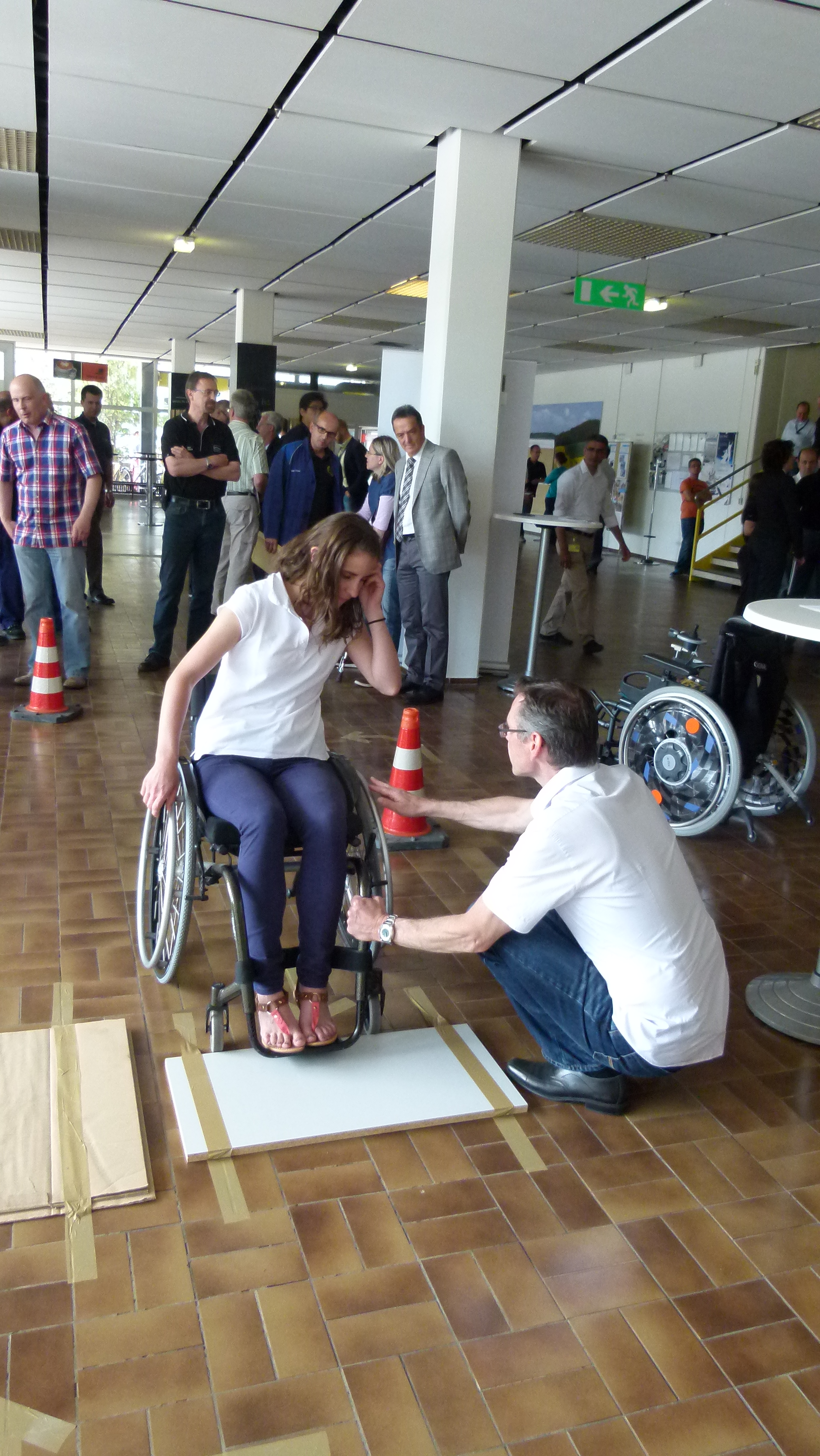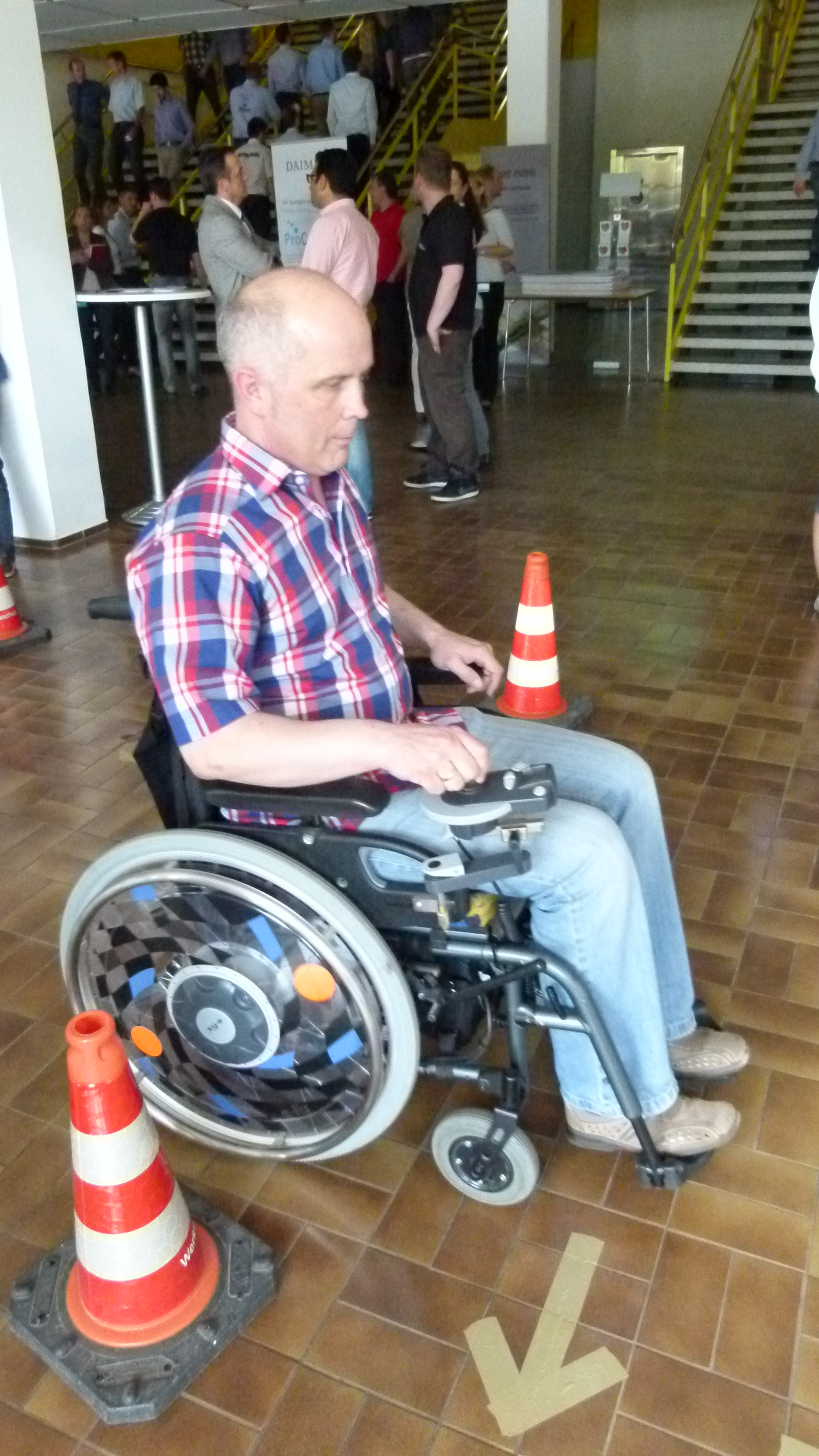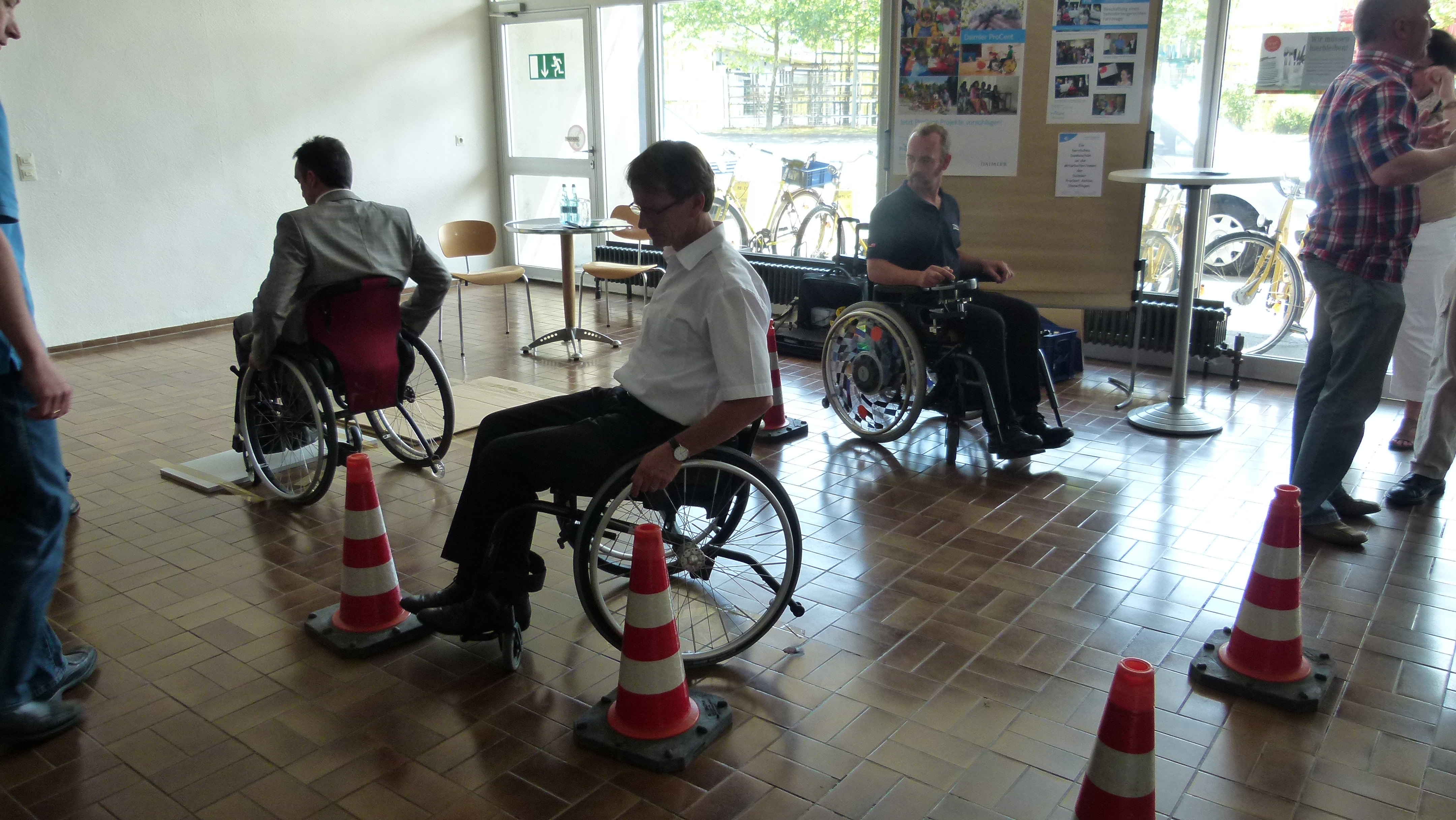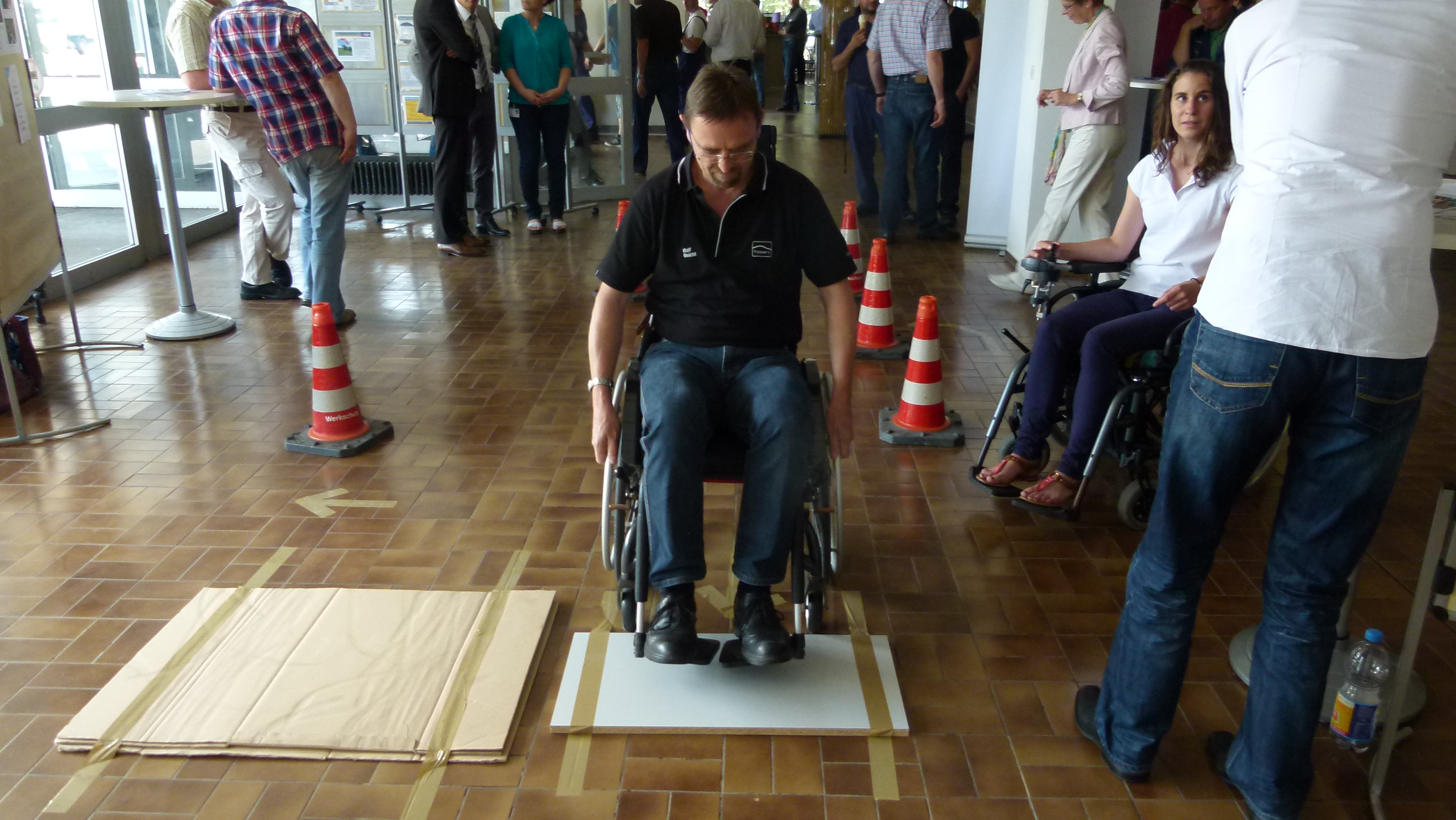 Diese Testfahrt-Aktion mit verschiedenen Rollstühlen und kleinen Hürden wurde sehr begrüßt und erhielt viel Zuspruch in der Belegschaft.