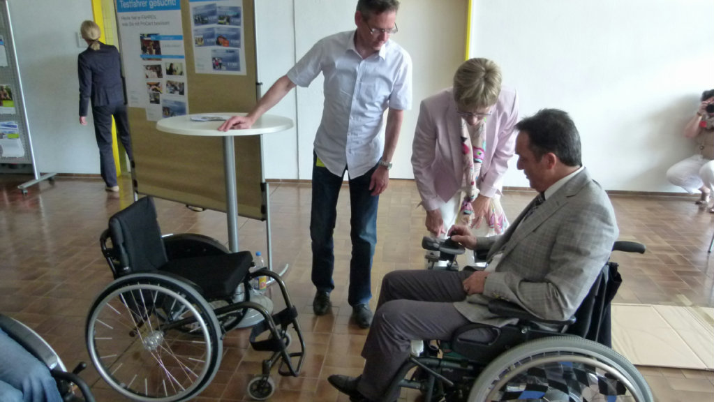 Und alle Interessierten bekommen die Gelegenheit zu testen, wie schwierig es ist einen Rollstuhl zu fahren, indem sie sich reinsetzen und einfach einmal selbst ausprobieren den Rollstuhl zu lenken - so wie Werkleiter Dr. Willi Reiss und der Betriebsratsvorsitzende Ergun Lümali.