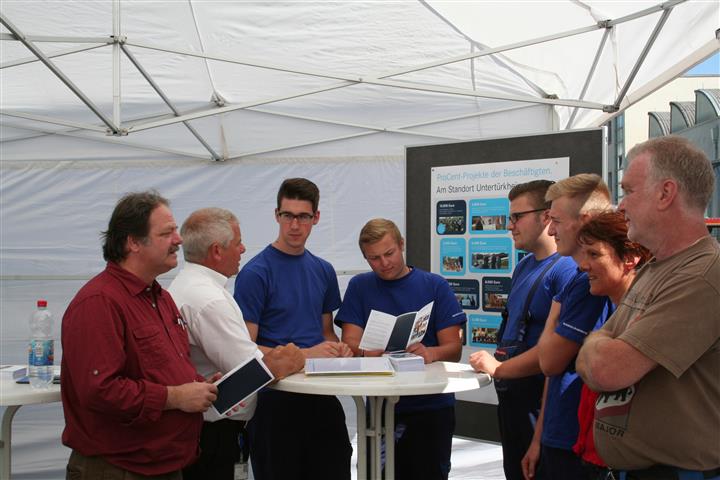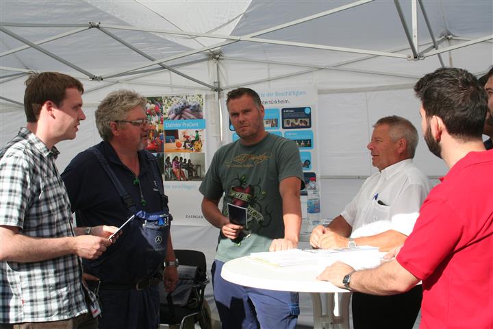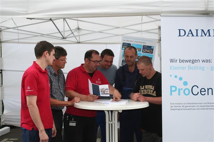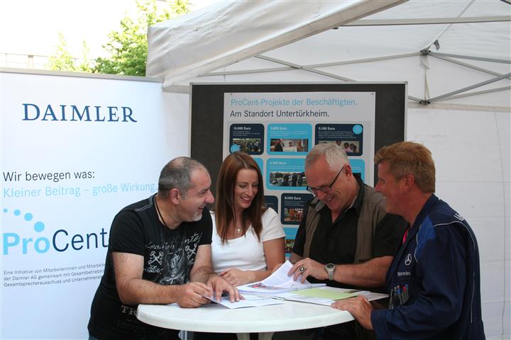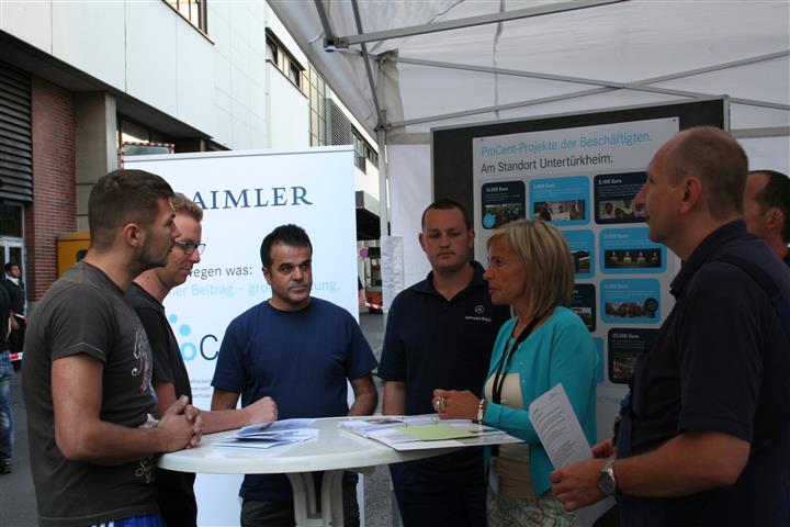 Im Rahmen der bundesweiten "Deutschen Aktionstage Nachhaltigkeit" konnten sich die Beschäftigten der Daimler AG am Standort Untertürkheim Ende Juni auf den Betriebsversammlungen in den Werkteilen Untertürkheim, Mettingen und Hedelfingen über ProCent-Projekte informieren. Der Betriebsrat des Mercedes-Benz Werkes Untertürkheim hat die ProCent-Aktionen organisiert. Die Werkleitung hat die Kosten für Plakate und die Informationsstände übernommen.