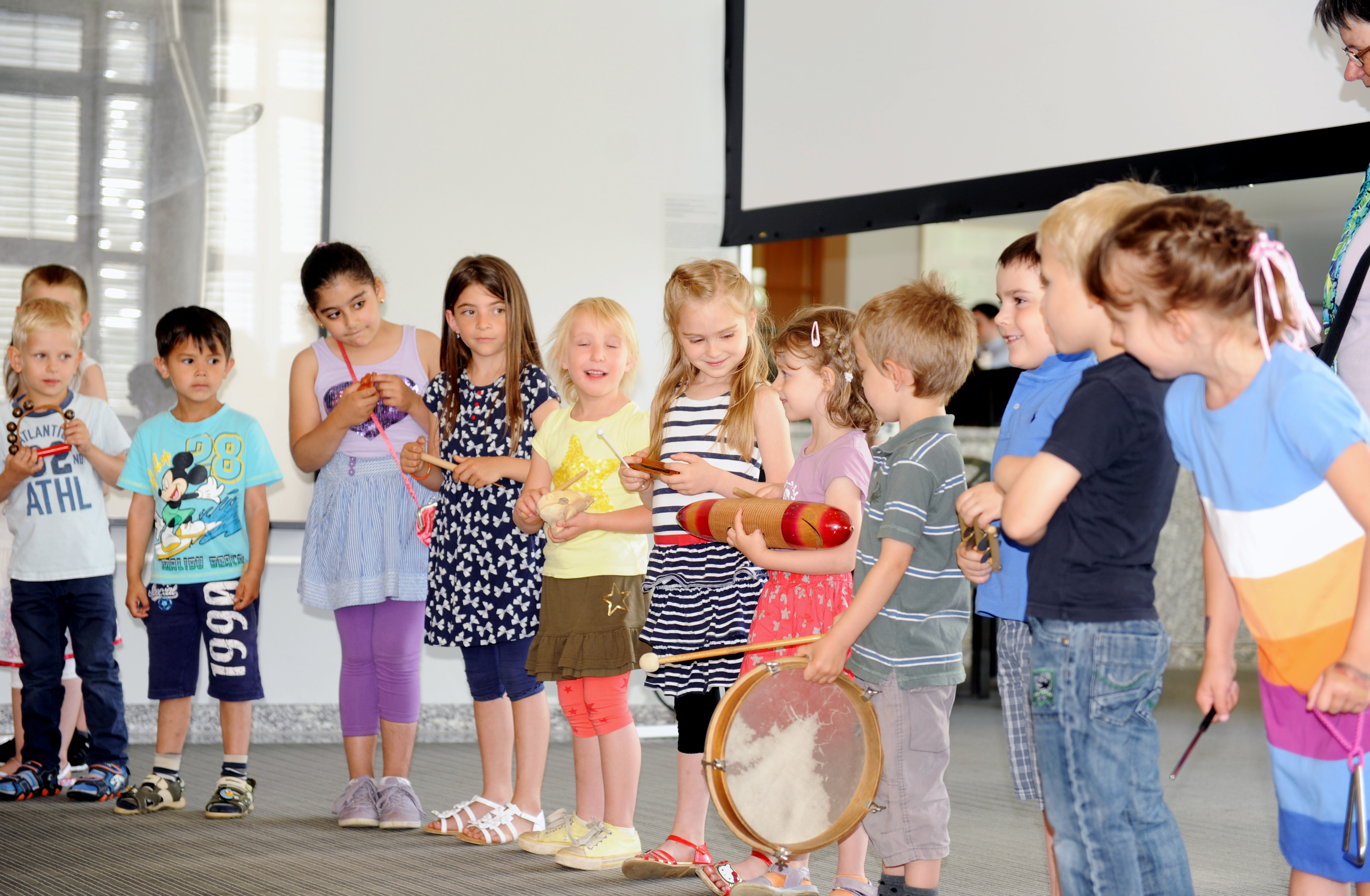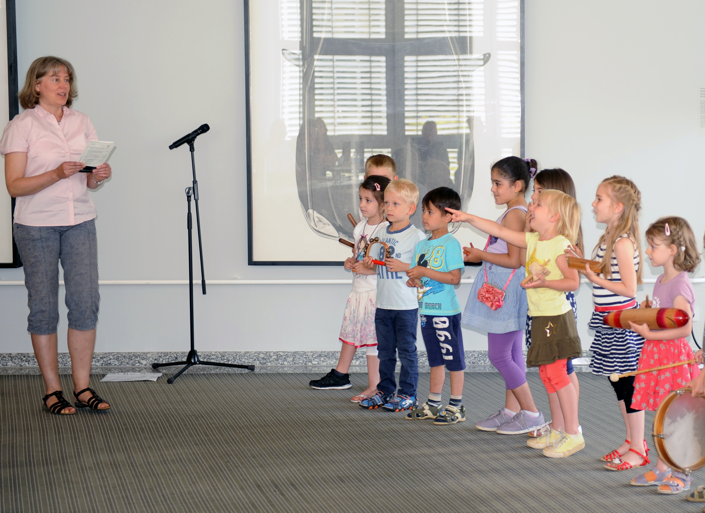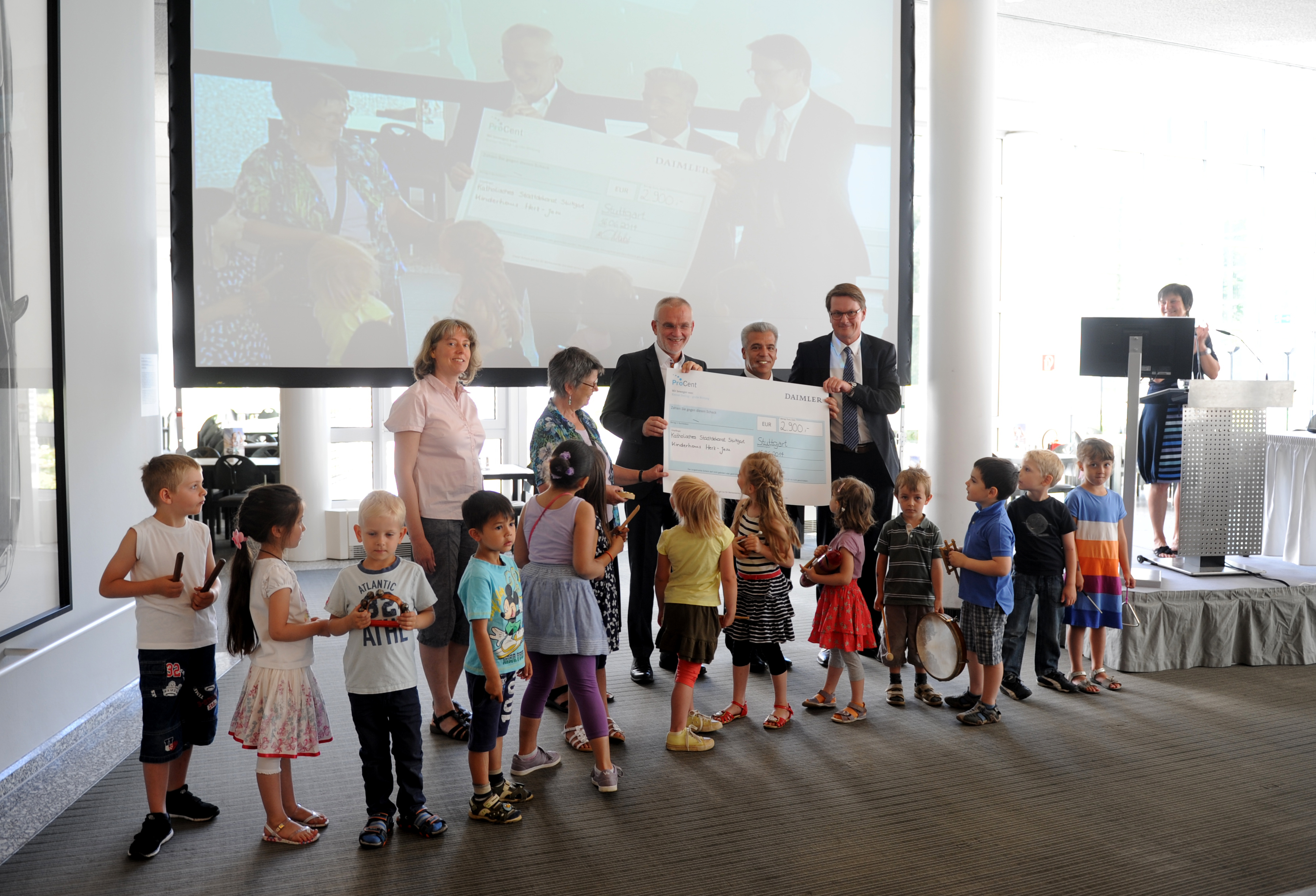 Auf der Betriebsversammlung in Möhringen am 24. Juni waren wir dann erneut mit dem Infostand vertreten und es gab zahlreiche gute Gespräch sowohl bzgl. möglicher künftiger Projektanträge als auch im Hinblick auf am Ehrenamt Interessierte. Besonderes Schmankerl in Möhringen: das katholische Kinderhaus Herz-Jesu, dass im Rahmen der Mittelvergabe im Juni 2.900 EUR für die musikalische Frühförderung von uns erhalten hat, erstürmte mit 13 Kindern nicht nur die BV, sondern auch die Herzen der Anwesenden. Nach einem kurzen Dank für die zur Verfügung gestellten Mittel durch die Leiterin der Einrichtung, Frau Belger, begeisterten uns die Kids zunächst mit einer musikalischen Vorführung, gefolgt von einer symbolischen Scheckübergabe durch den Betriebsrat , die Geschäftsleitung, und den Einreicher des Projektes, Nejdet Niflioglu. Anschließend tobten die Kids noch eine wenig über unsere wenig genutzten Wiesen, wurden mit Süßigkeiten und Getränken verwöhnt und erfüllten den "Campus Möhringen" mit fröhlichem Kinderlachen.