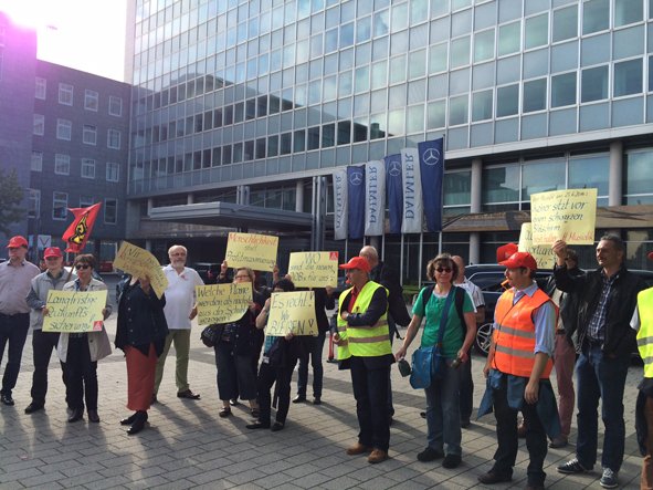 In einem bunten Zug mit vielen Schildern zogen sie mit lautem Pfeifkonzert vom Untertürkheim Tor durchs Werksgelände vor das Geb. 137/1, dem Verhandlungsort. Unterstützung kam aus anderen betroffenen Werken Wörth, Mannheim und Untertürkheim.
