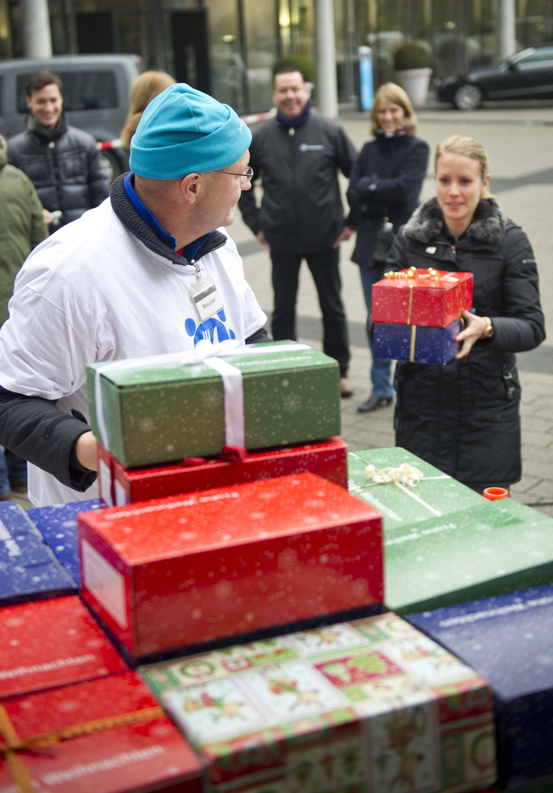 Daimler-Mitarbeiter übergeben ihre Geschenke aus der Weihnachtsaktion "Schenk ein Lächeln".