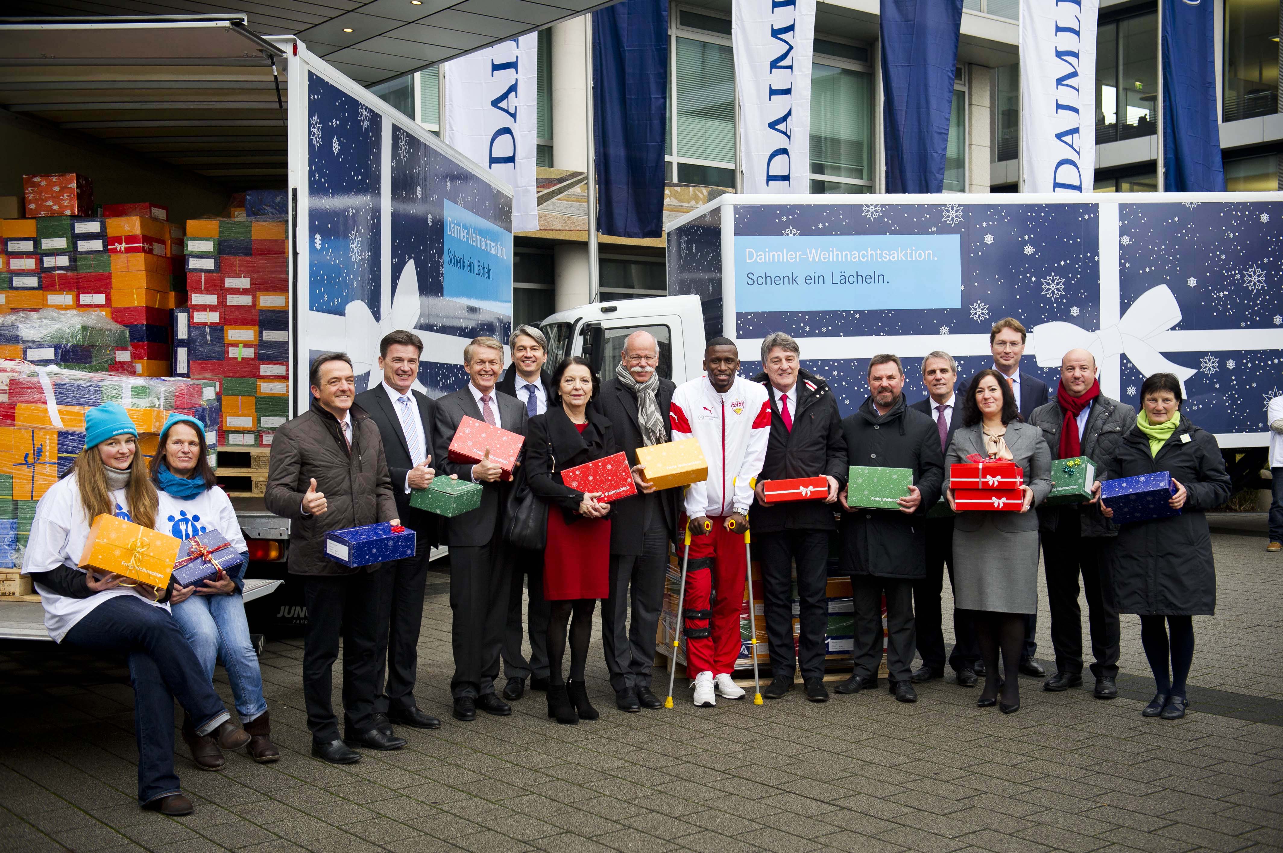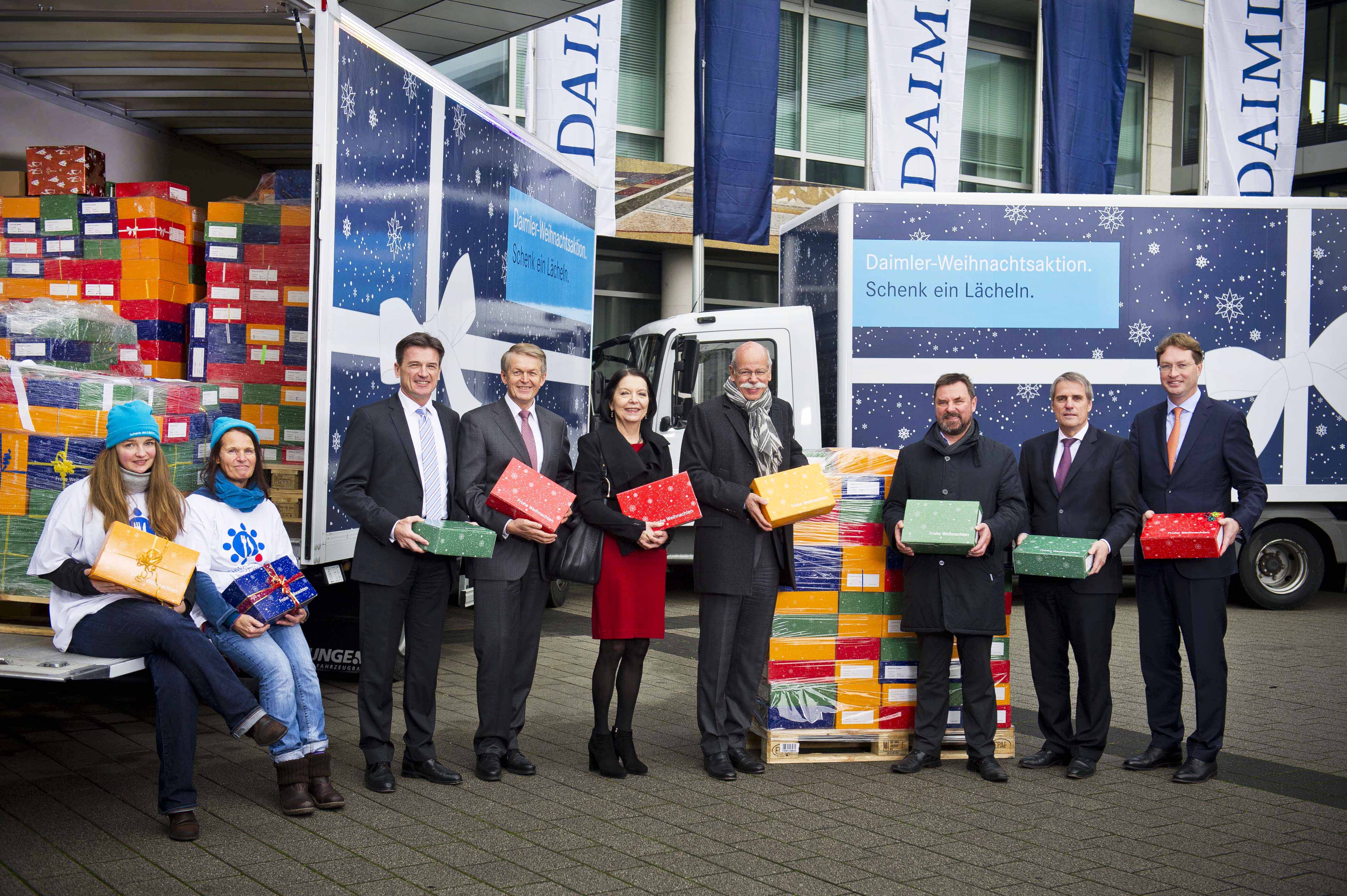 Vorstandsmitglieder von Daimler übergeben die von Mitarbeitern gepackten Weihnachtsgeschenke aus der Aktion "Schenk ein Lächeln" (v.l. Mitarbeiterinnen der Schwäbischen Tafel, Wolfgang Bernhard (Vorstand Daimler Trucks and Buses), Thomas Weber (Vorstand Konzernforschung und Mercedes-Benz Cars Entwicklung), Christine Hohmann-Dennhardt (Vorstand Integrität und Recht), Dieter Zetsche (Vorstandsvorsitzender Daimler AG und Leiter Mercedes-Benz Cars), Hermann Beck (Schwäbische Tafel e.V.), Wilfried Porth (Vorstand Personal und Arbeitsdirektor & Mercedes-Benz Vans) und Ola Källenius (ab Januar 2015 Vorstand Mercedes-Benz Cars Vertrieb)
