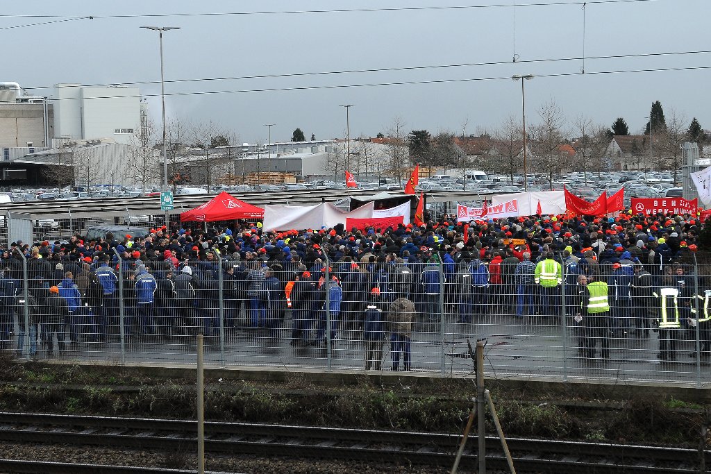 Mannheim. Von 08:30 bis 09:30 Uhr haben ca. 4.200 Beschäftigte der Früh- und Normalschicht bei Mercedes-Benz und EvoBus in Mannheim die Arbeit niedergelegt und sich am Tor 2 versammelt, um für die Forderungen der IG Metall zu demonstrieren.