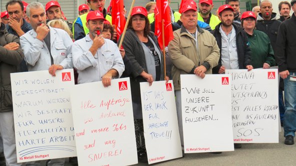 Zur Kundgebung kamen auch Delegationen von Porsche Zuffenhausen und vom Mercedes-Benz Werk Untertürkheim. Sie bekundeten ihre Solidarität mit den Magna-Beschäftigten.