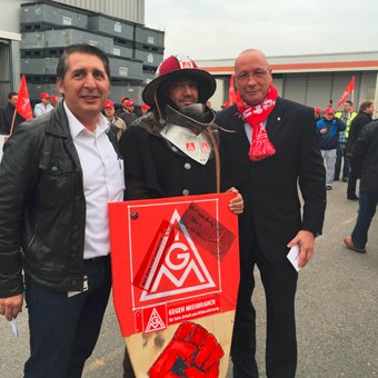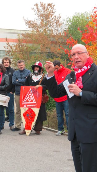Auf der Kundgebung sprach Uwe Hück, Konzernbetriebsratsvorsitzender der Porsche AG: "Die CTS Kolleginnen und Kollegen haben die Vorratskammer von Magna gefüllt. Jetzt erwarte ich, dass sie auch einen Teil zurückbekommen,