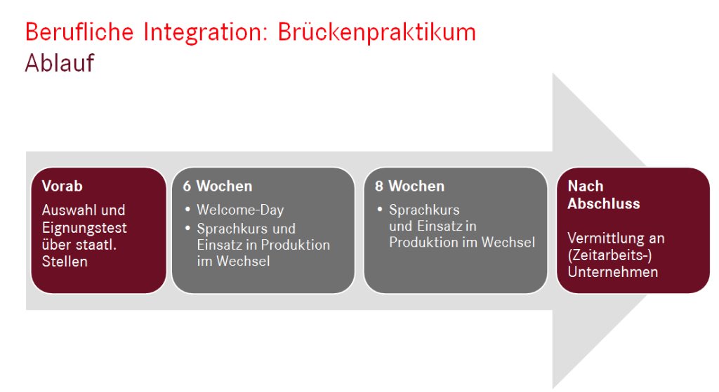 Wir halten das Brückenpraktikum für eine sinnvolle Maßnahme, um Menschen, die sich hier eine Zukunft aufbauen wollen, Orientierung und Leitung zu geben. Deshalb starten jetzt auch an anderen Standorten Brückenpraktika: In Rastatt, Bremen, Ludwigsfelde und Gaggenau. Weitere Standorte kommen hinzu, so dass im ersten Halbjahr rund 300 Brückenpraktikanten bei uns sein werden.