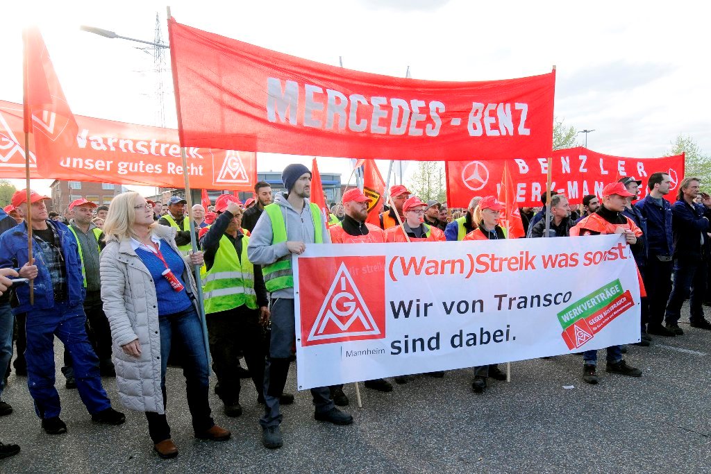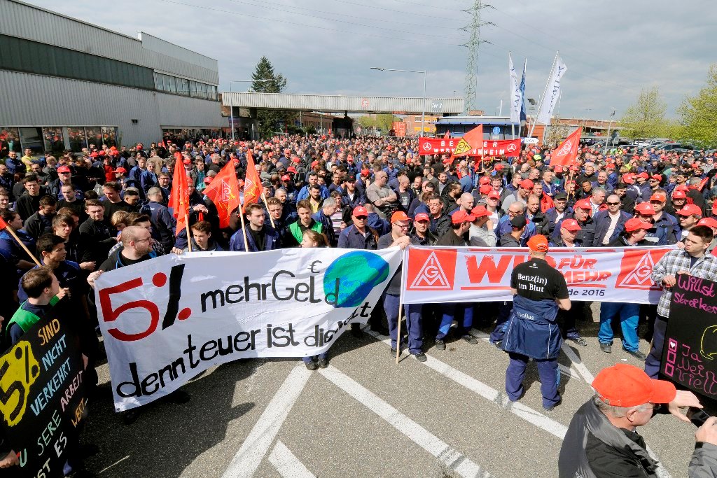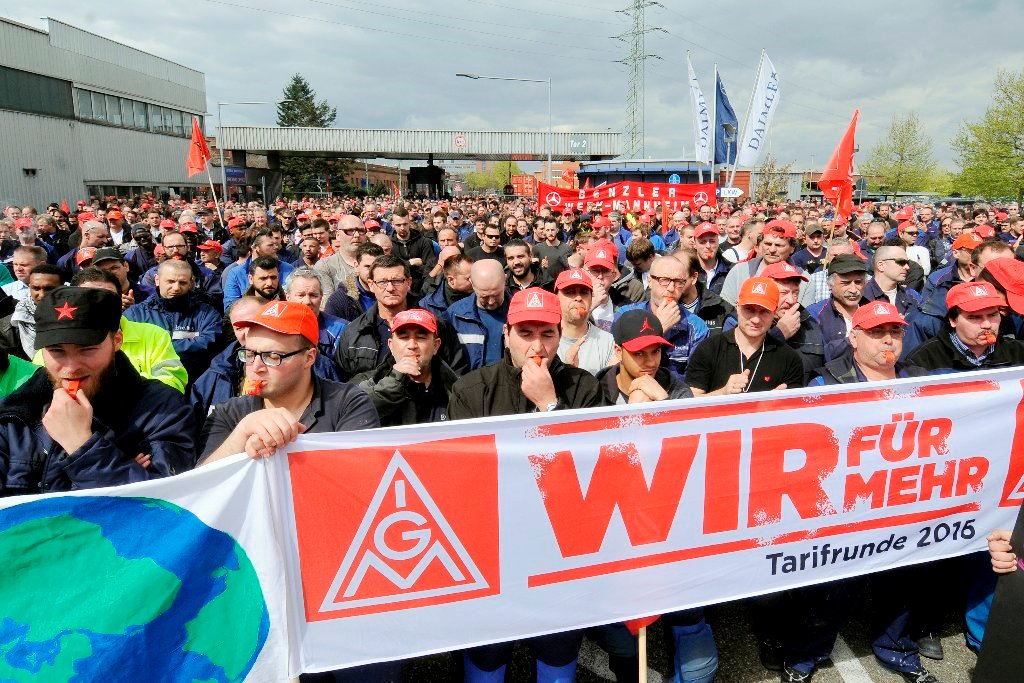 Am 29.04.2016 haben ca. 4.500 Beschäftigte bei Mercedes-Benz und EvoBus in Mannheim (Früh- und Normalschicht sowie Mittelschicht) die Arbeit niedergelegt und sich am Tor 2 versammelt, um für die Forderungen der IG Metall zu demonstrieren.