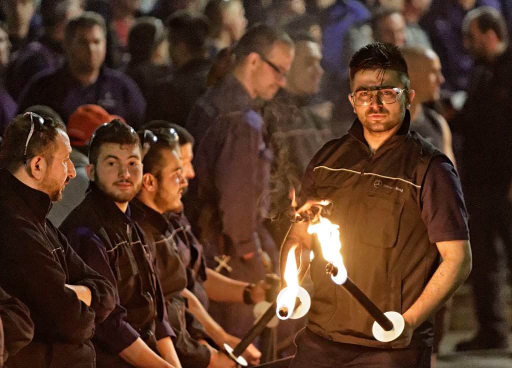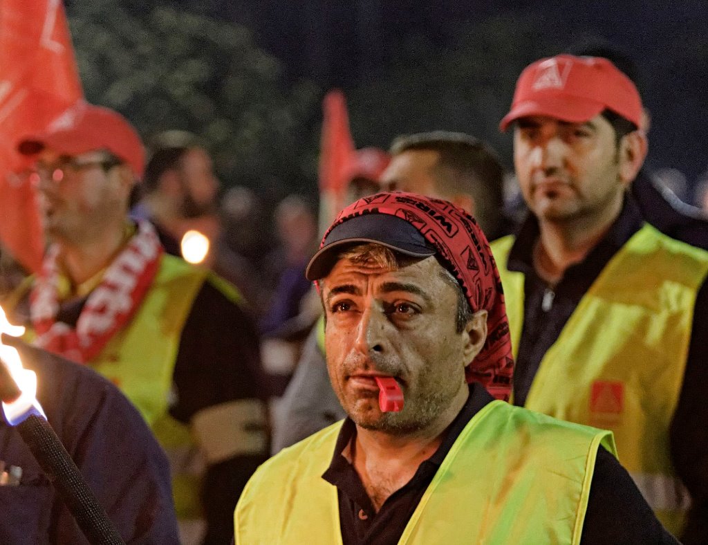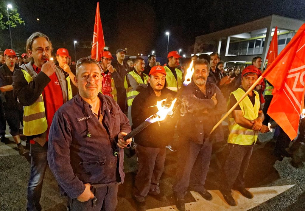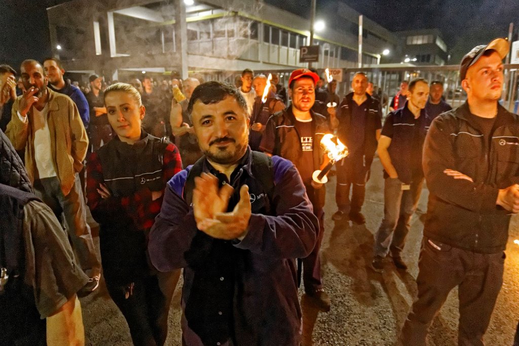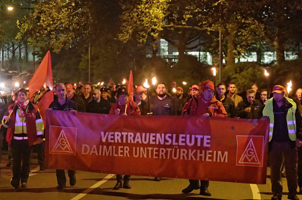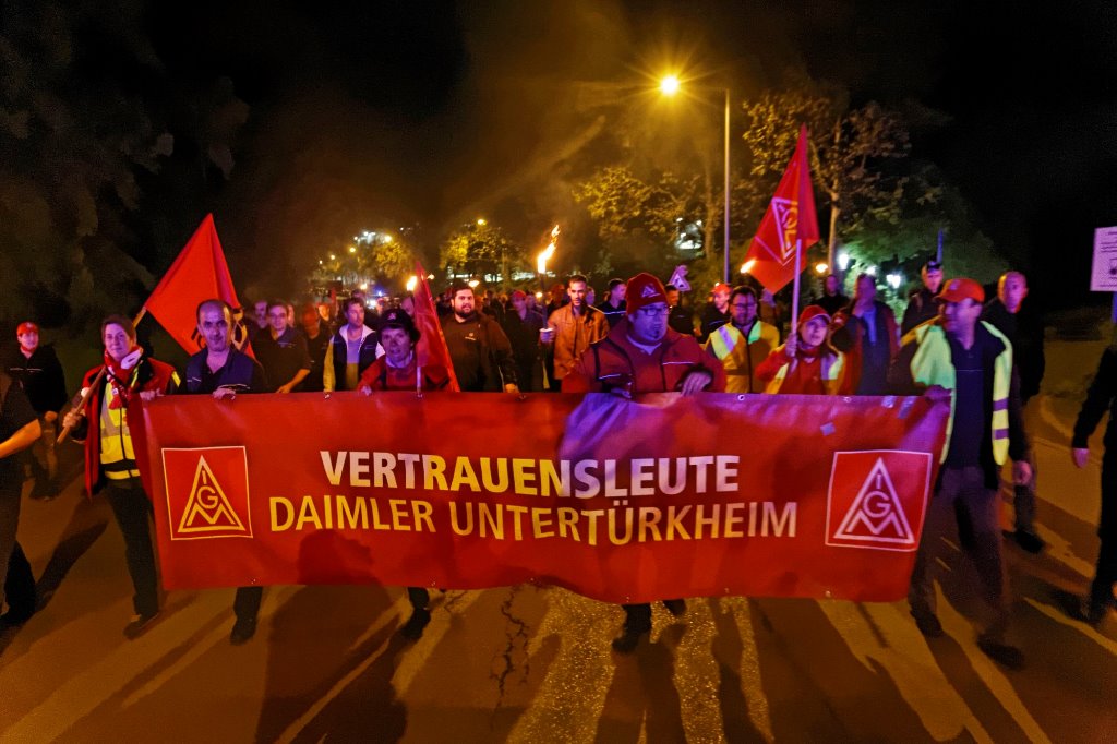 Mit Fackeln und Fahnen machten die Kolleginnen und Kollegen der Mercedes-Benz Werkteile Hedelfingen und Mettingen vor den Werkstoren lautstark auf die Tarifrunde und ihren Warnstreik aufmerksam.