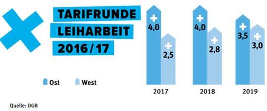 Die neuen Entgelttarifverträge bringen für die Leiharbeitnehmer bis 2019 ein jährliches Plus zwischen 2,5 und 3 Prozent im Westen und 4 und 3,5 Prozent im Osten.