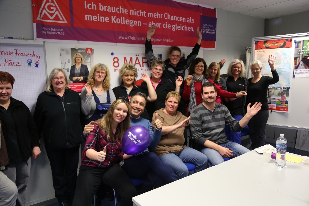 Bei den diesjährigen 17 Frauentagcafés, die von engagierten IG Metall-Betriebsrätinnen und -Betriebsräten und Helferinnen liebevoll dekoriert und mit Informationsmaterial gespickt waren, ging es im Austausch vor allem darum: Wie begegnen wir dem Verfügbarkeitswahn und wann schalten wir mal ab? Wie steht es um die Vereinbarkeit von Familie und Beruf, mit den Möglichkeiten der neuen Betriebsvereinbarung Mobiles Arbeiten? Und wie wirken sich neue Arbeitsformen, im Zuge der digitalen Entwicklung, darauf aus?