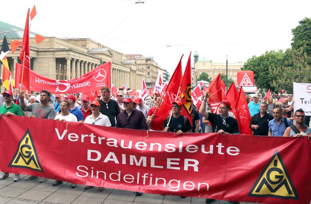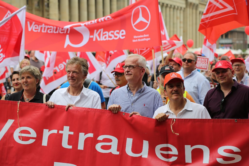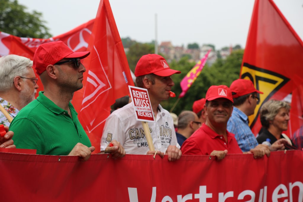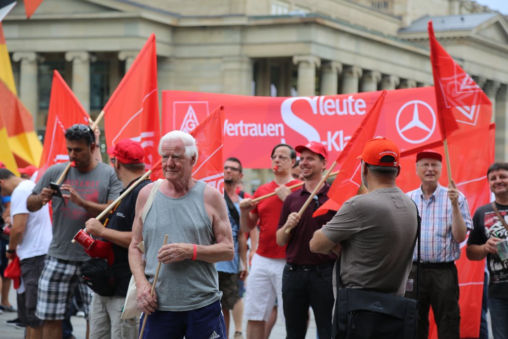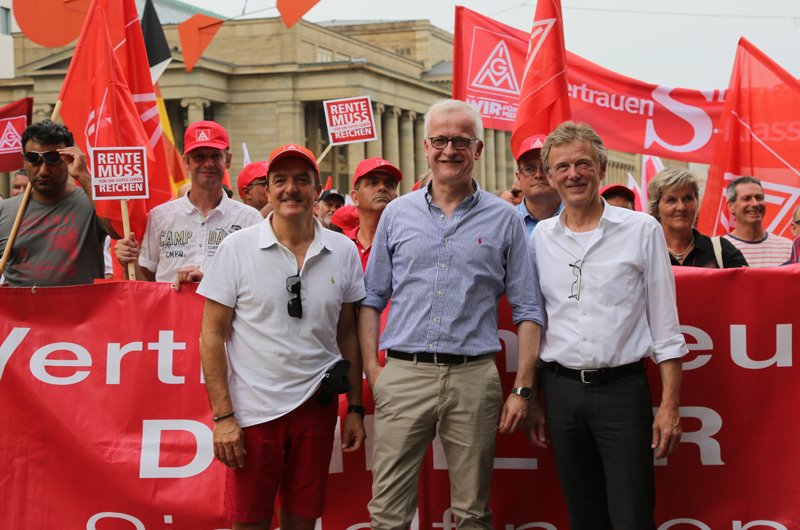 "Wir sind hier, wir sind laut, weil man uns die Rente klaut" demonstrierten lautstark ungefähr 1000 Beschäftigte, darunter viele von Daimler aus Sindelfingen. Sie folgten damit dem Aufruf der IG Metall und der Daimler Vertrauenskörperleitung und versammelten sich auf dem Stuttgarter Schlossplatz zur gemeinsamen Kundgebung von IG Metall, DGB und ver.di, um für soziale Gerechtigkeit und eine gute Rente zu demonstrieren.