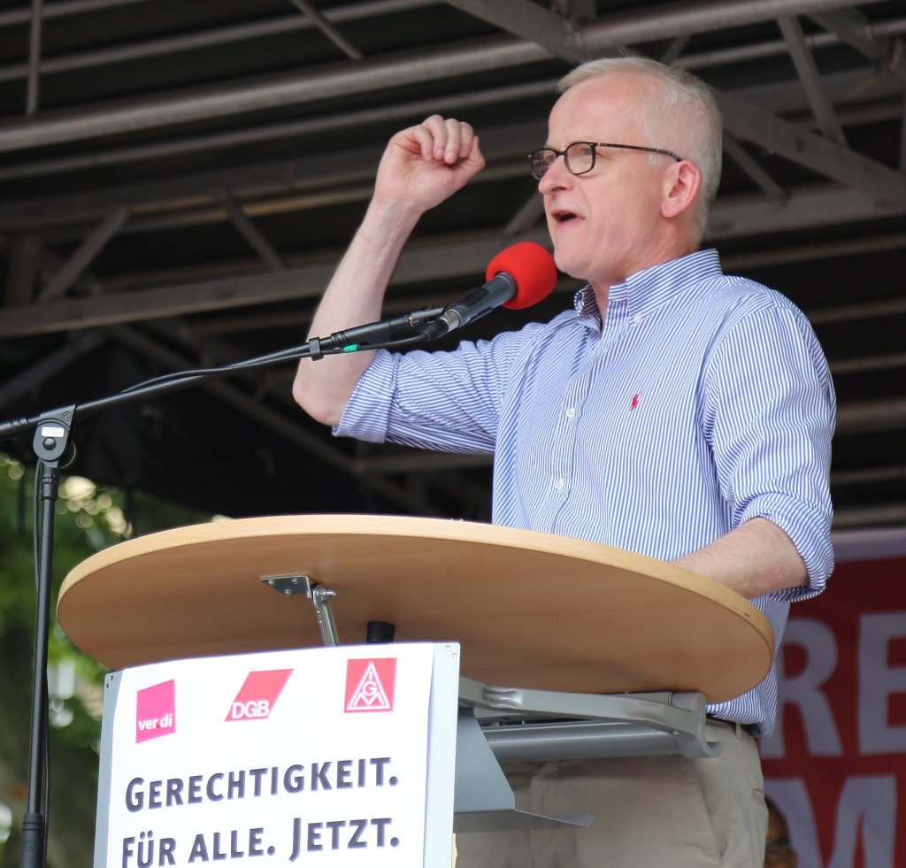 Dr. Hans-Jürgen Urban, geschäftsführendes Vorstandsmitglied der IG Metall forderte soziale Sicherheit: "Die Altersgrenzen müssen runter und das Niveau muss wieder rauf!" Burnout drohe zur Volkskrankheit des 21. Jahrhunderts zu werden. Das Recht auf Gesundheit sei ein Menschenrecht und müsse geschützt werden.