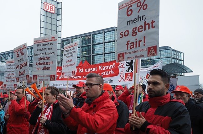Etwa 350 kampbereite Berliner Metallerinnen und Metaller läuteten lautstark den Auftakt der Verhandlungen vor dem Tagungshotel in Berlin ein. Die erste Runde für die Metall- und Elektroindustrie in Berlin und Brandenburg endete mit einer Konfrontation.