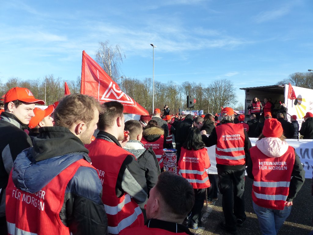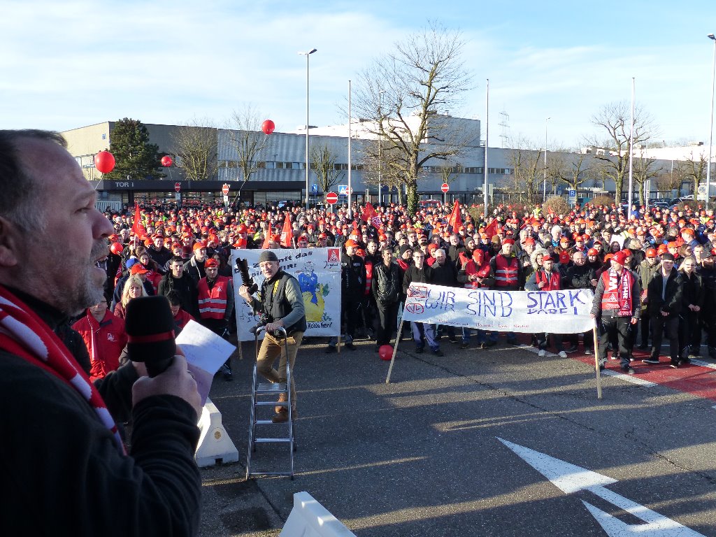 Vor den Toren des Mercedes-Benz Werk Rastatt bildete sich eine lange (Warnstreik-)Schlange von Kolleginnen und Kollegen. Die IG Metall Gaggenau hatte zu einem Protestmarsch außerhalb des Werksgeländes aufgerufen. Eine Maßnahme, die von Tausenden Rastatter MetallerInnen begeistert aufgenommen wurde. Mit einem lautstarken Trillerpfeifenkonzert und vielen selbst gestalteten Transparenten zeigten die Rastatter Selbstbewußtsein und Flagge.