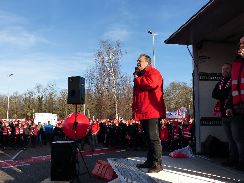 Auf der Kundgebung informierten Uwe Krause, stellvertretender Betriebsratsvorsitzender Mercedes-Benz Rastatt und Udo Roth, stellvertretender Betriebsratsvorsitzender "Benz" Gaggenau sowie Claudia Peter, 1. Bevollmächtigte der IG Metall Gaggenau über den Stand im Tarifkonflikt der Metall- und Elektroindustrie.