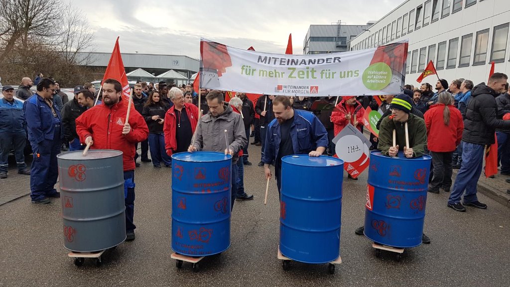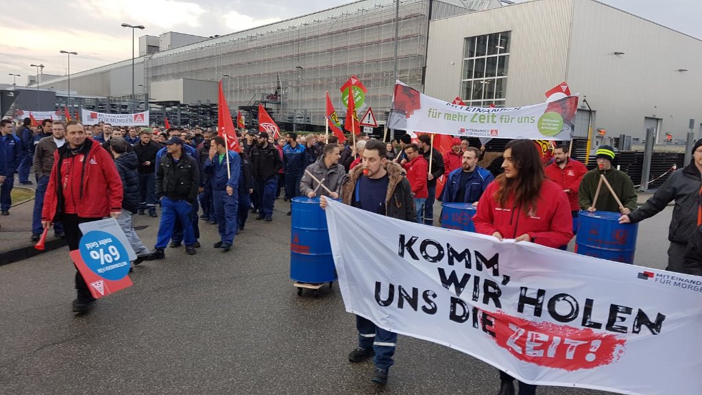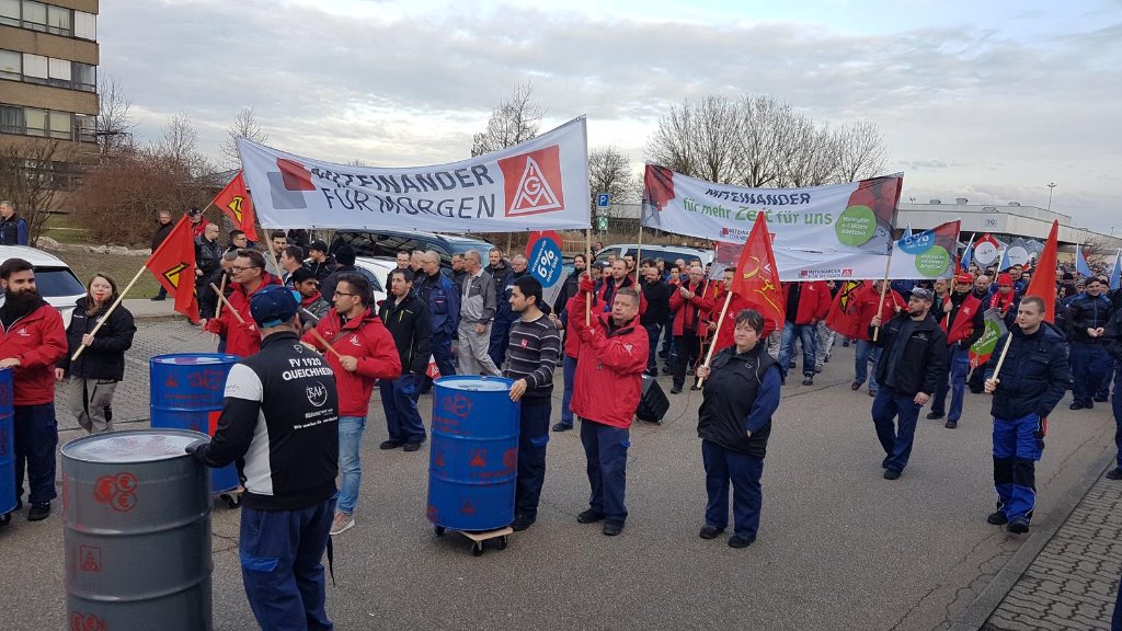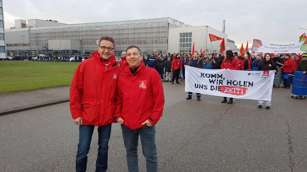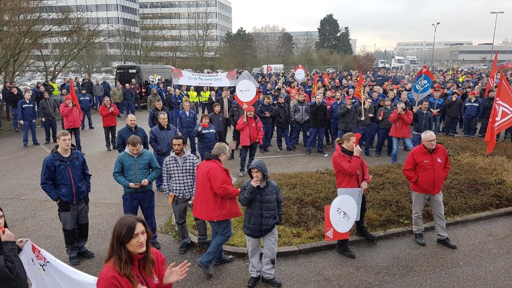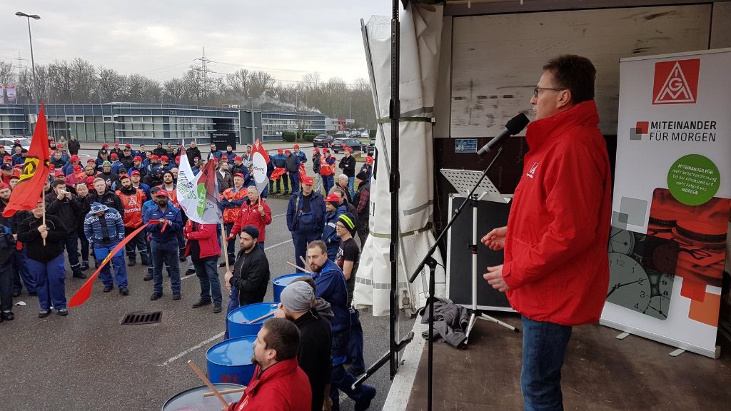 Zum Warnstreikauftakt berichteten der erste Bevollmächtigte der IG Metall Neustadt, Ralf Köhler und der Bezirksleiter des IG Metall Bezirks Mitte, Jörg Köhlinger von den Tarif-Verhandlungen am 16. November 2018 in Mainz und 6. Dezember 2018 in Darmstadt. Sie bekräftigten auch die Forderungen der IG Metall: