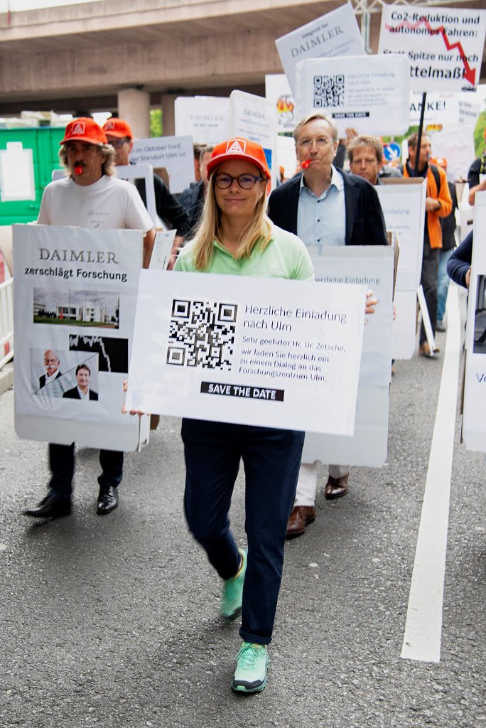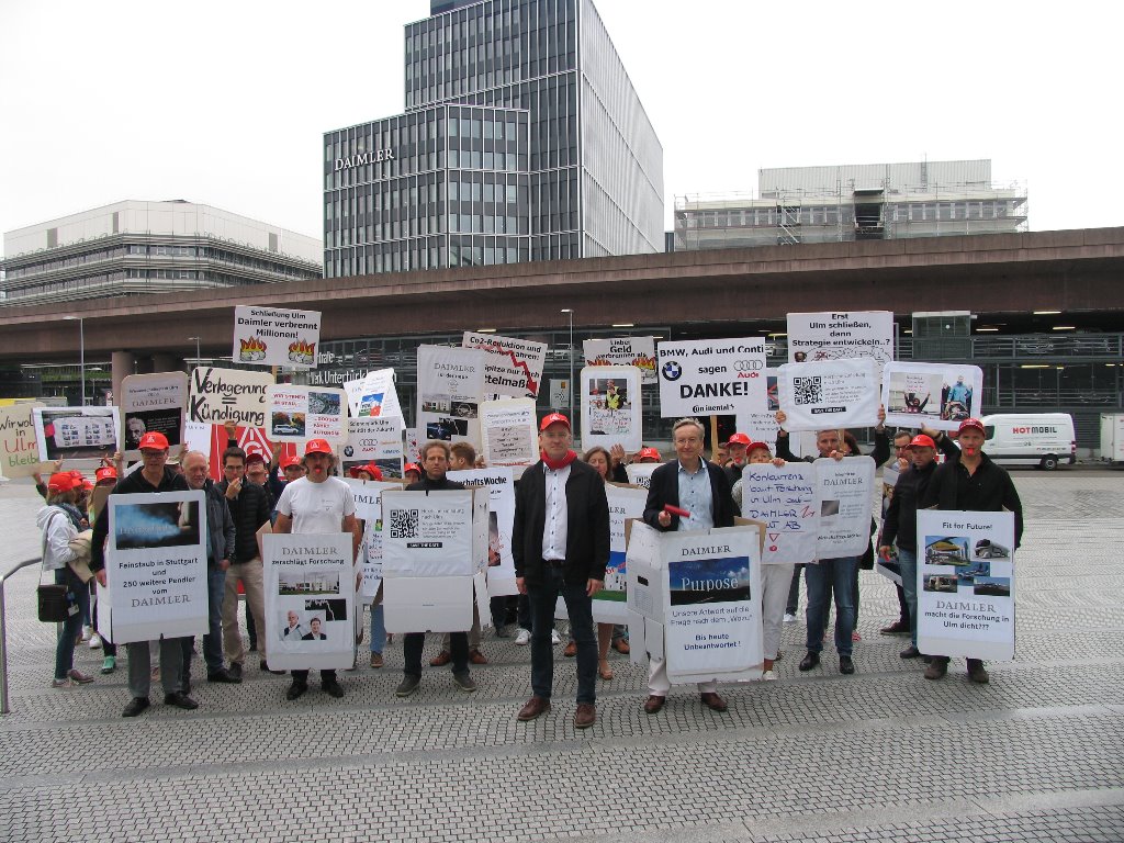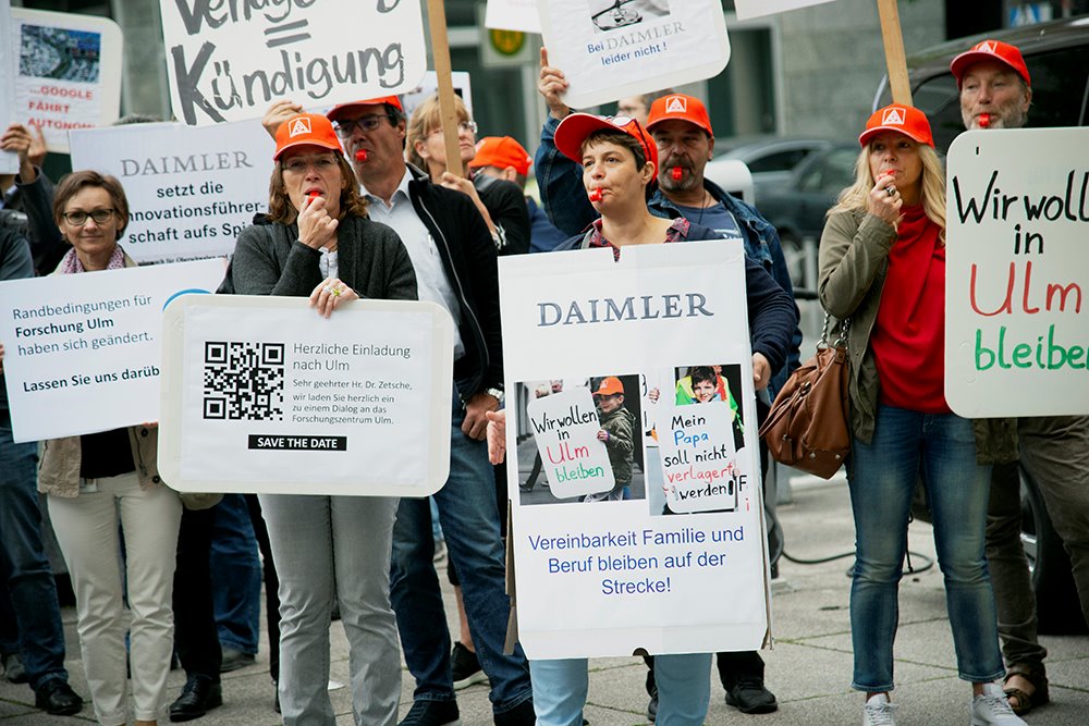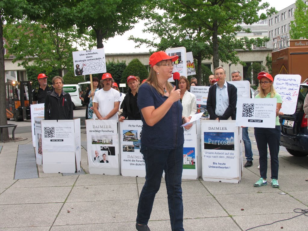 Am 12. Juli 2018 demonstrierten vor dem Vorstandsgebäude bei Daimler in Untertürkheim ca. 50 Beschäftigte aus dem Daimler Forschungszentrum Ulm für den Erhalt ihres Standorts. Die Metallerinnen und Metaller überbrachten eine symbolische Einladung für den Vorstandsvorsitzenden Dieter Zetsche den Standort in Ulm zu besuchen und mit der dortigen Belegschaft und den lokalen Verantwortlichen ins Gespräch zu kommen. Im Anschluss an die Kundgebung standen Vertreterinnen und Vertreter des Betriebsrats und der IG Metall den Medien zur Verfügung.