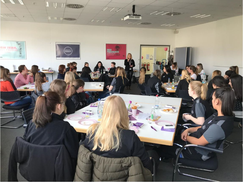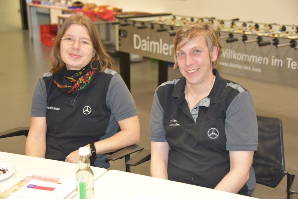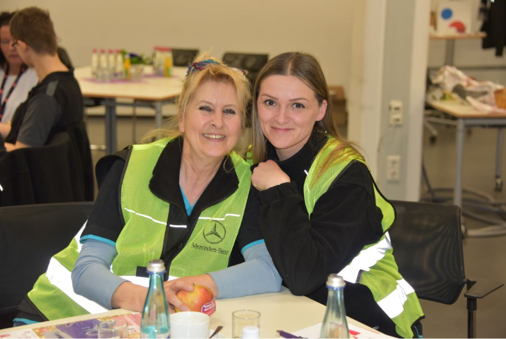 Melanie Rössler (li.) aus PT/STF gehört als Frau in ihrem Bereich zur Minderheit, wie sie sagt. Sie freut sich über die Frauencafés, weil sie hier andere Frauen kennenlernen und ins Gespräch kommen kann. "Außerdem ist es schön auch mal einen Einblick in die Themen in anderen Bereichen zu bekommen", sagt Melanie. Großes Verbesserungspotential sieht sie in der Situation von Frauen mit Kindern in der Produktion. "Mütter in der Produktion kommen aus ihren Schichtverträgen nicht raus. Für diejenigen, die ihre Kinder gerne mit erziehen möchten, sorgt das für eine enorme Belastung. Ich würde mir vom Unternehmen wünschen, dass diese Frauen besser unterstützt werden.