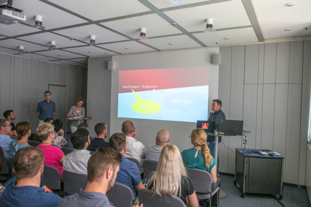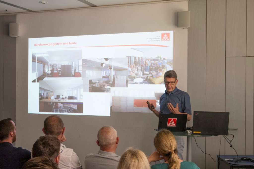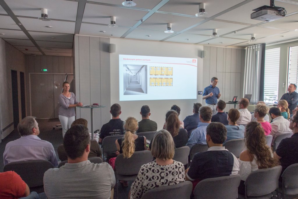 Stefan Wolf gab zunächst einen Überblick zur allgemeinen Entwicklung der Büro-Arbeitsplatzgestaltung. Anschließend ging Markus Bausbacher auf die betrieblichen Anforderungen ein. Dabei betonte er die Notwendigkeit, die Kolleginnen und Kollegen bereits in der Planungsphase einzubeziehen, um individuelle und abteilungsspezifische Bedürfnisse besser berücksichtigen zu können.