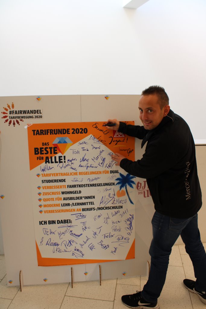 Bei der Funktionärskonferenz am 19. Februar 2020 haben sich die Anwesenden für die Jugendforderungen zur Tarifrunde ausgesprochen. Um ein Zeichen zu setzen, dass sie hinter der IG Metall Jugend stehen, haben sie eine Unterschriften-Aktion gestartet, an der sich viele der anwesenden Kolleginnen und Kollegen auch von Daimler beteiligt haben.