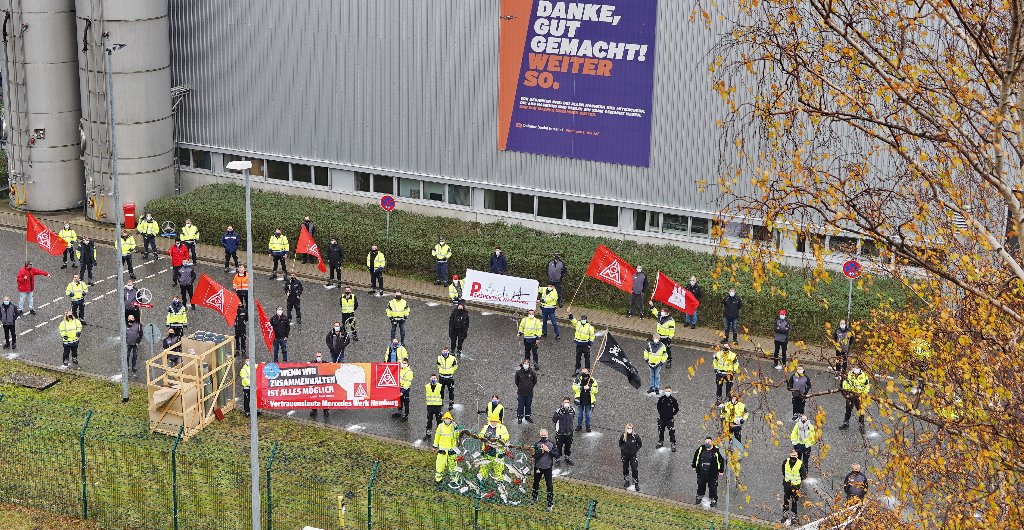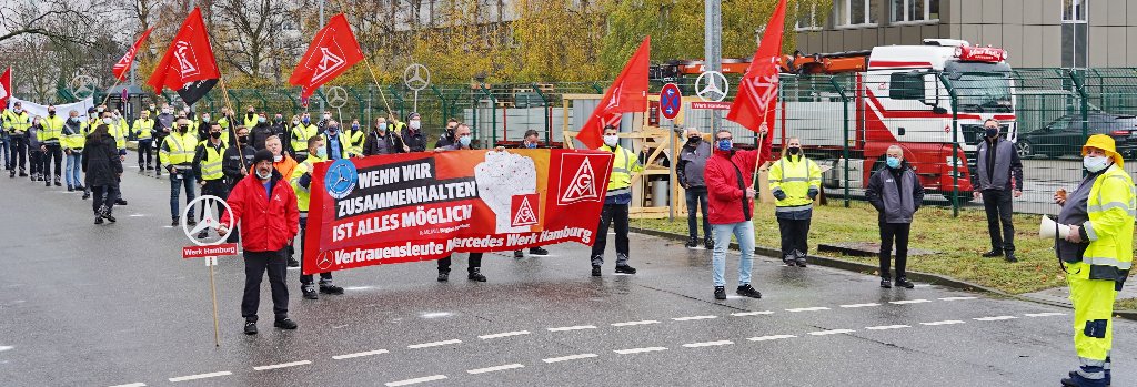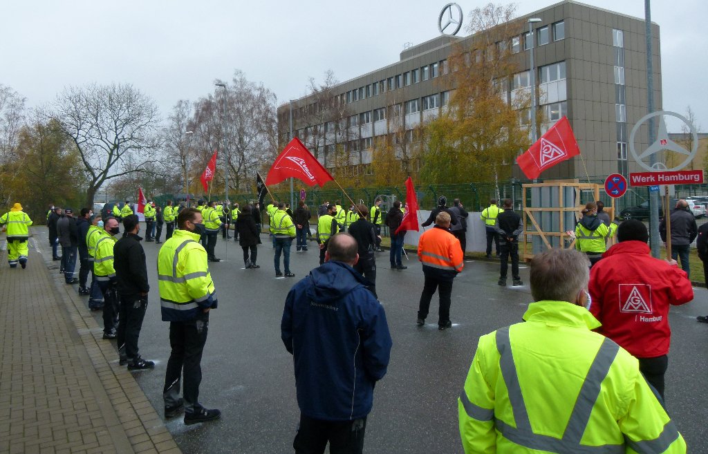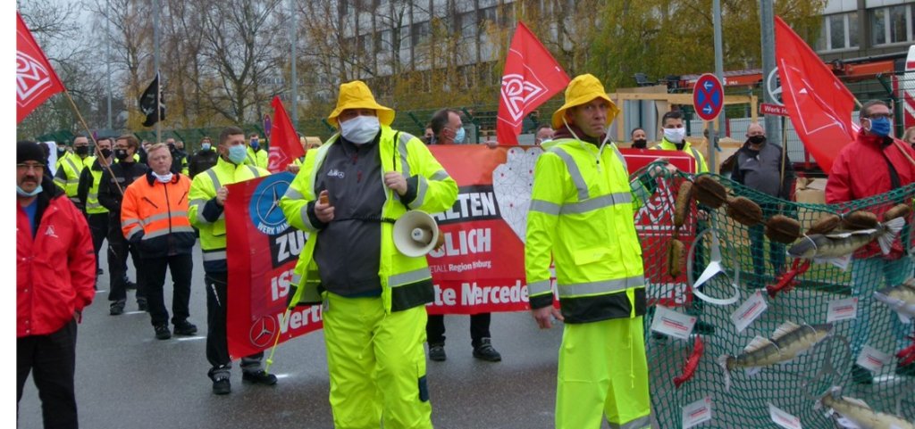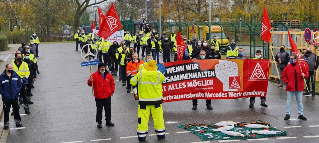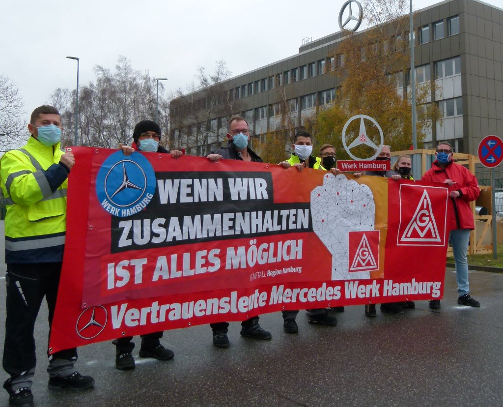 In unseren Werken lassen wir keinen durchs Netz fallen!!! Unter diesem Motto haben die IG Metall Betriebsräte zur Solidaraktion der Werke hier am Standort Hamburg aufgerufen. Corona-konform kamen jeweils Abordnungen aus allen Hallen und Bereichen des Werkes zusammen.