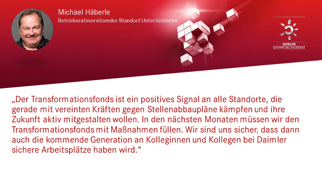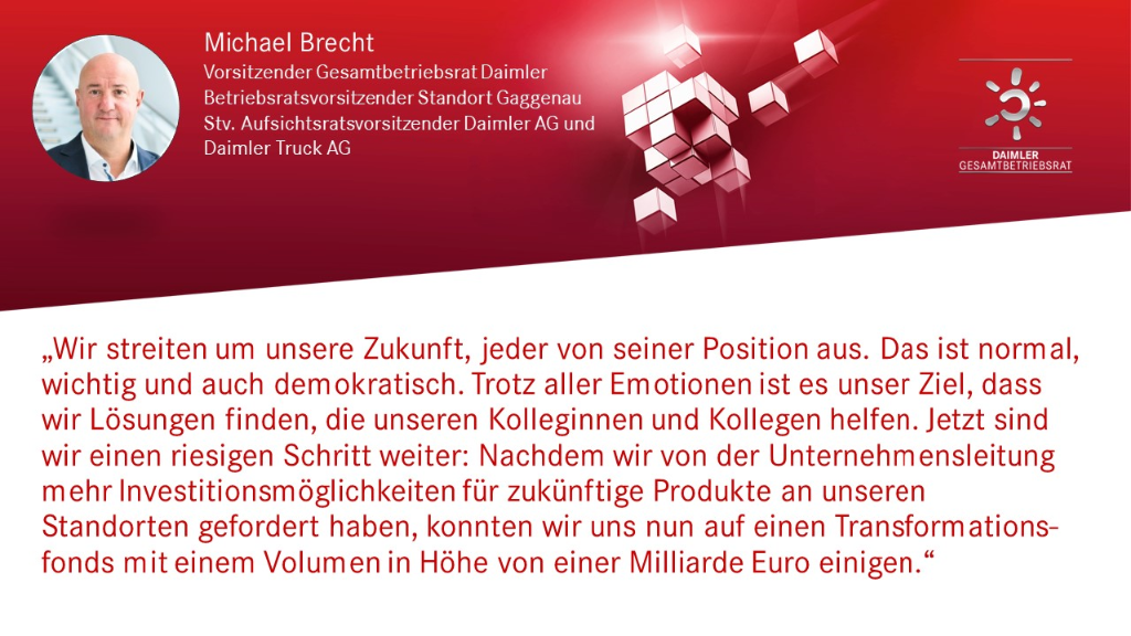 Ende letzter Woche wurde der Daimler Investitionsplan für die nächsten fünf Jahre verabschiedet. Darin enthalten: Mehr als 70 Milliarden Euro für Forschung und Entwicklung sowie für Sachinvestitionen. Ein klares Zeichen für die Zukunft, schließlich liegt der Fokus ganz klar auf neuen Technologien und Tätigkeitsfeldern. Zusätzlich zu dieser eindrucksvollen Summe wird auf unsere Forderung hin ein Transformationsfonds mit einem Volumen in Höhe von einer Milliarde Euro eingerichtet - ebenfalls mit einer Laufzeit von fünf Jahren. Das haben wir im Aufsichtsrat, Arbeitnehmer- mit der Kapitalseite, gemeinsam beschlossen.