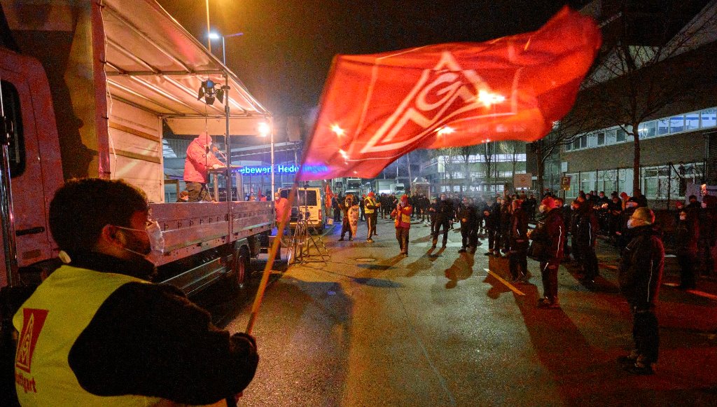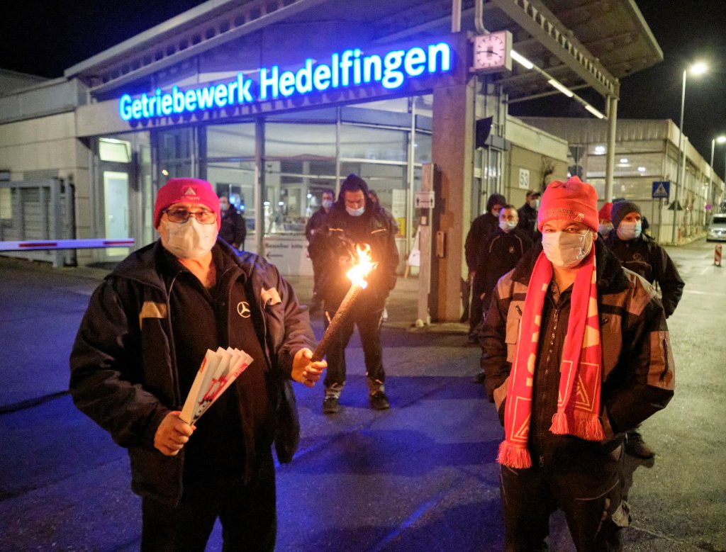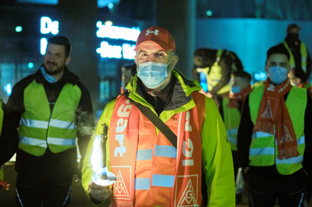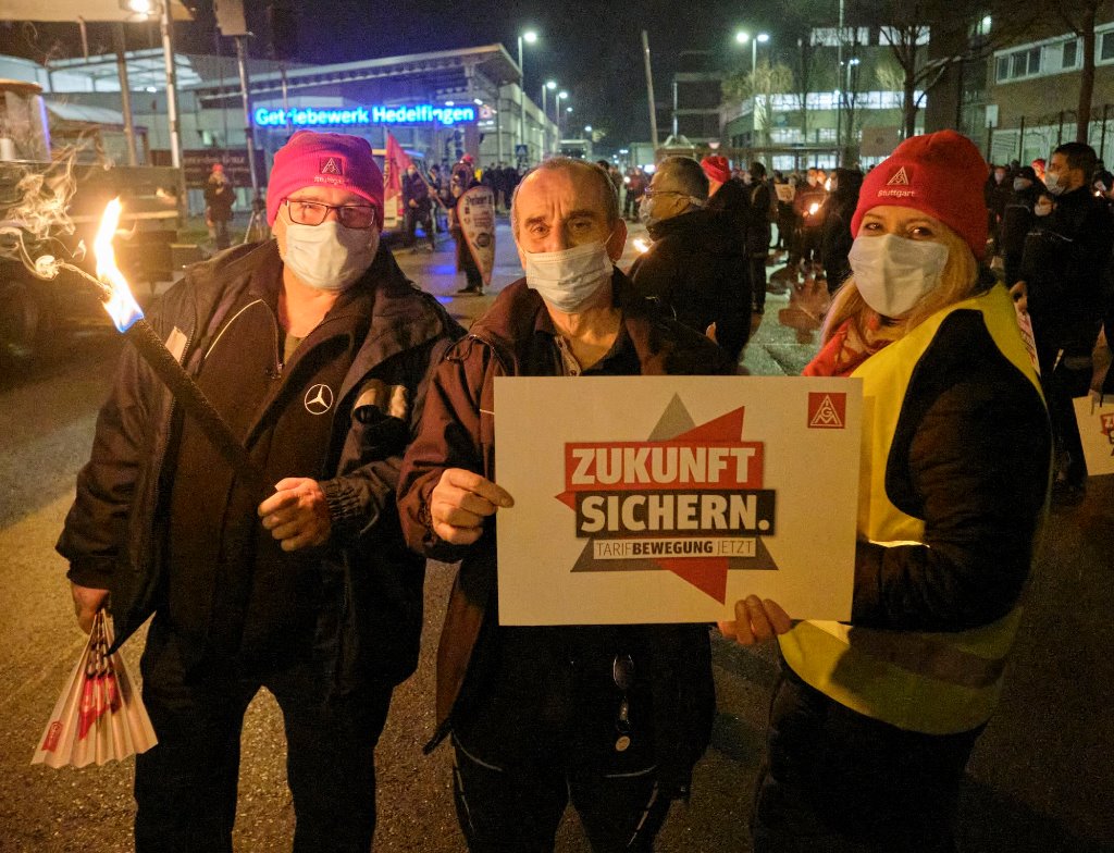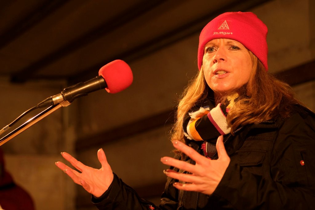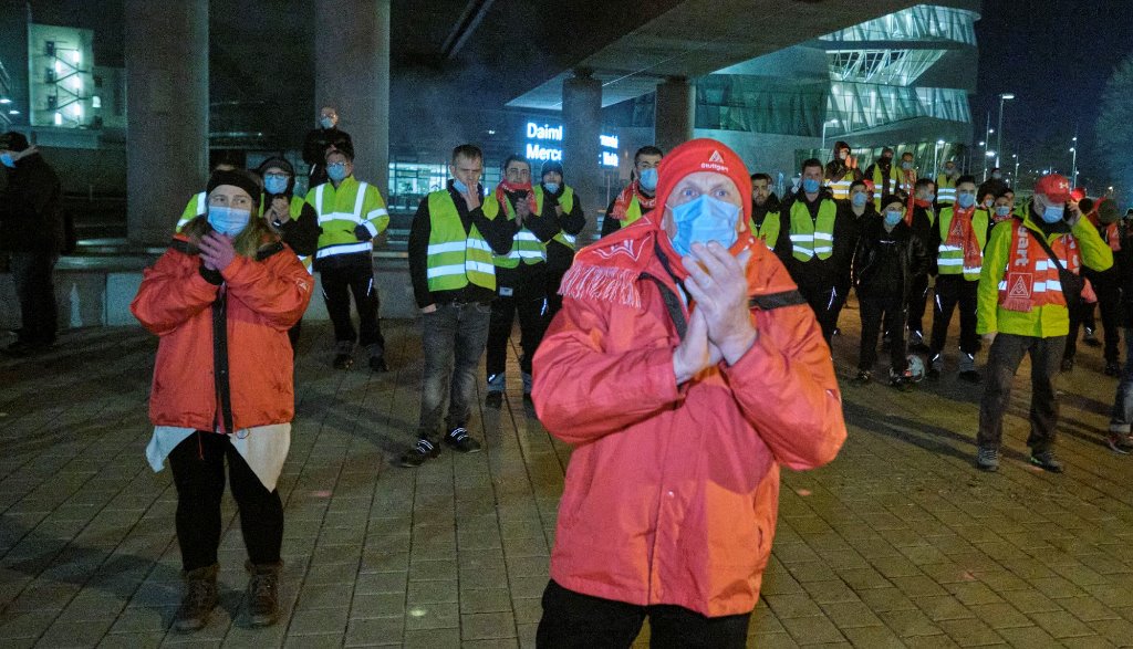 Den Auftakt des Warnstreiktages machte die Nachtschicht. Die Beschäftigten folgten dem Aufruf der IG Metall und legten bereits 2,5 Stunden vor dem eigentlichen Arbeitsende um 3:30 Uhr die Arbeit nieder. Begleitend zu diesem sogenannten "Frühschluss" fand eine Kundgebung im Werkteil Hedelfingen statt, auf der Michael Häberle, der Betriebsratsvorsitzende im Mercedes-Benz Werk Untertürkheim und Nadine Boguslawski, die Geschäftsführerin der IG Metall in Stuttgart die Warnstreikenden über den aktuellen Verhandlungsstand in der Tarifauseinandersetzung informierten.